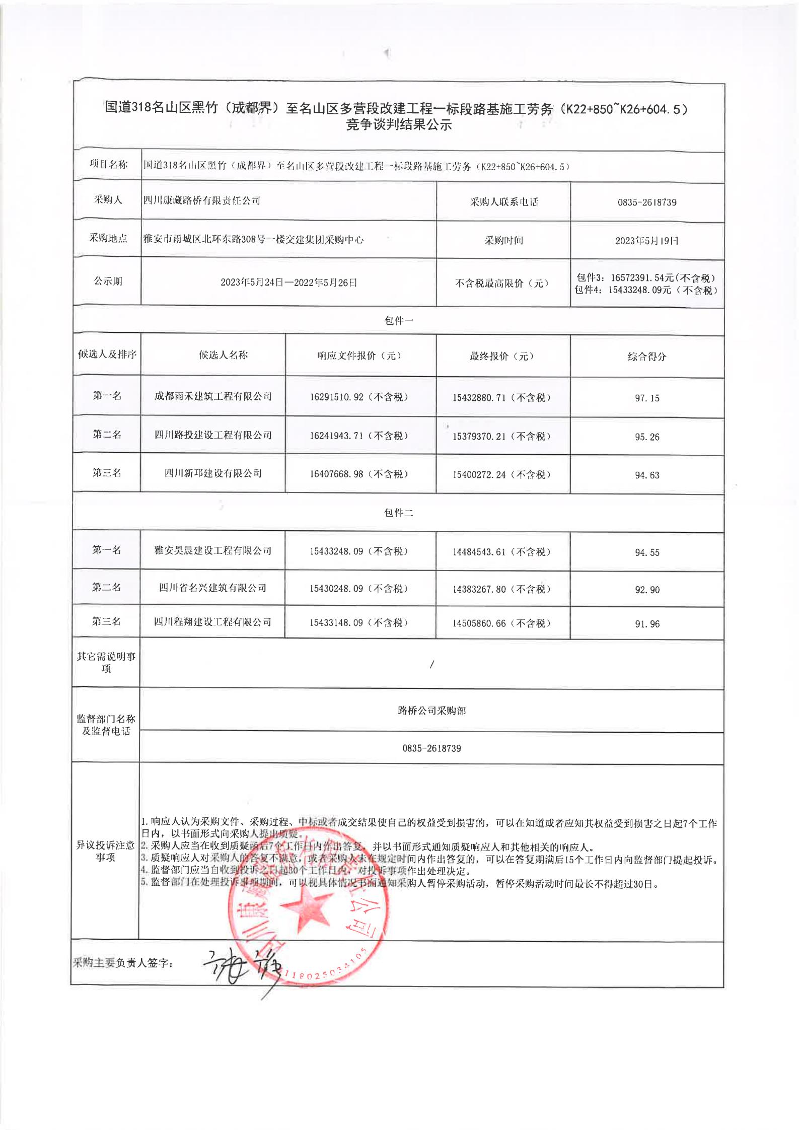 四川康藏路橋有限責任公司國道318名山區(qū)黑竹(成都界)至雨城區(qū)多營段改建工程一標段路基施工勞務(wù)(K22+850~K26+604.5)競爭談判結(jié)果公示