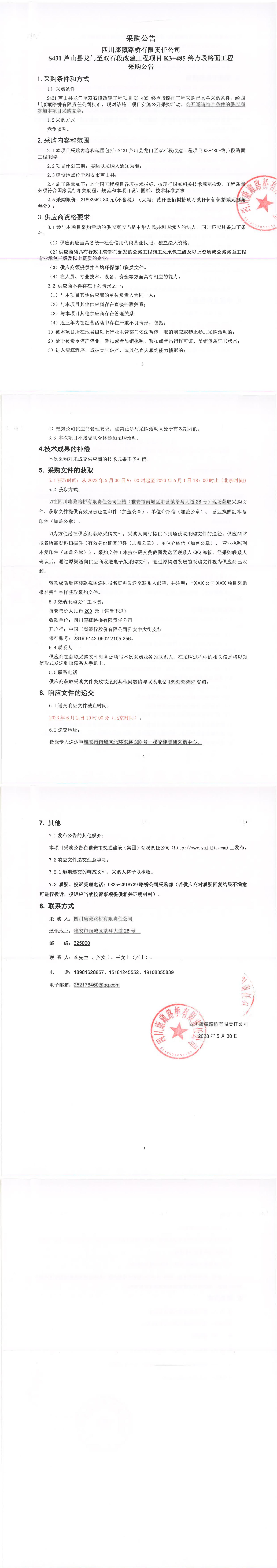 四川康藏路橋有限責(zé)任公司S431蘆山縣龍門至雙石段改建工程項目K3+485-終點段路面工程采購公告