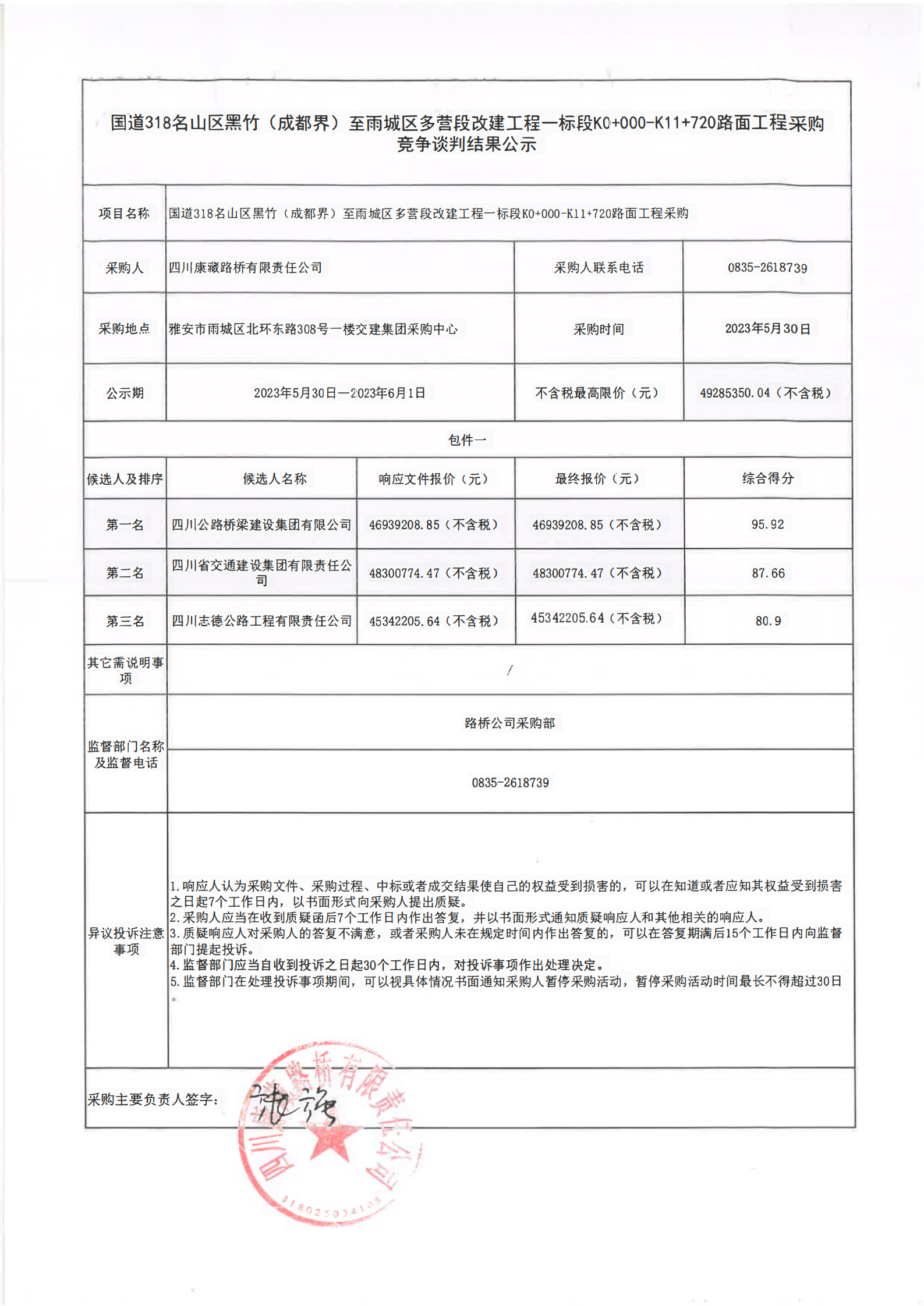 四川康藏路橋有限責(zé)任公司國(guó)道318名山區(qū)黑竹(成都界)至雨城區(qū)多營(yíng)段改建工程一標(biāo)段K0+000-K11+720路面工程采購(gòu)競(jìng)爭(zhēng)談判結(jié)果公示