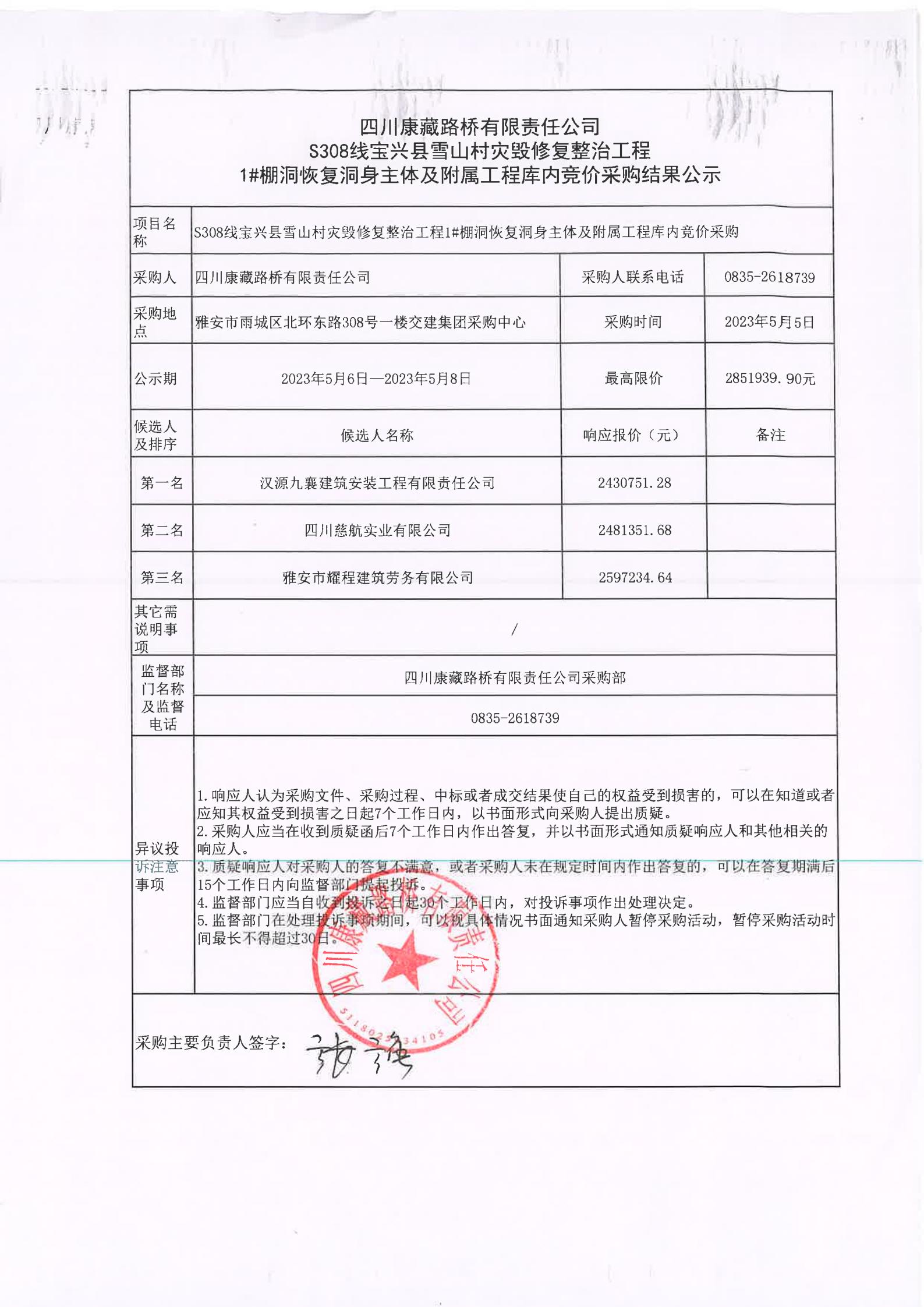 四川康藏路橋有限責(zé)任公司S308線寶興縣雪山村災(zāi)毀修復(fù)整治工程1#棚洞恢復(fù)洞身主體及附屬工程庫(kù)內(nèi)競(jìng)價(jià)采購(gòu)結(jié)果公示