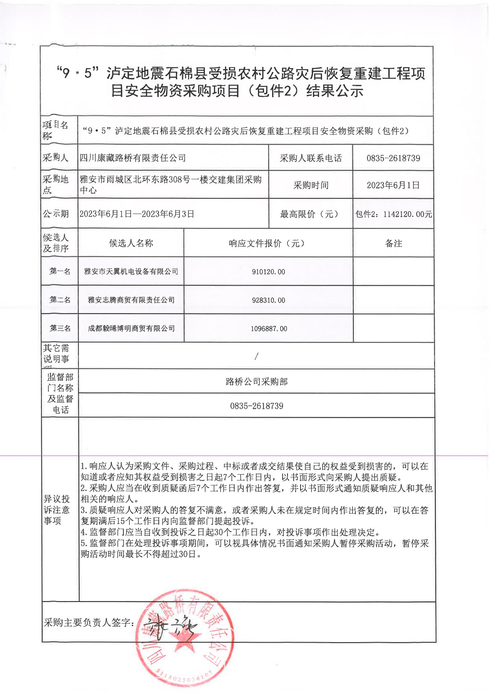 四川康藏路橋有限責任公司“9·5”瀘定地震石棉縣受損農村公路災后恢復重建工程項目安全物資項目(包件2)結果公示