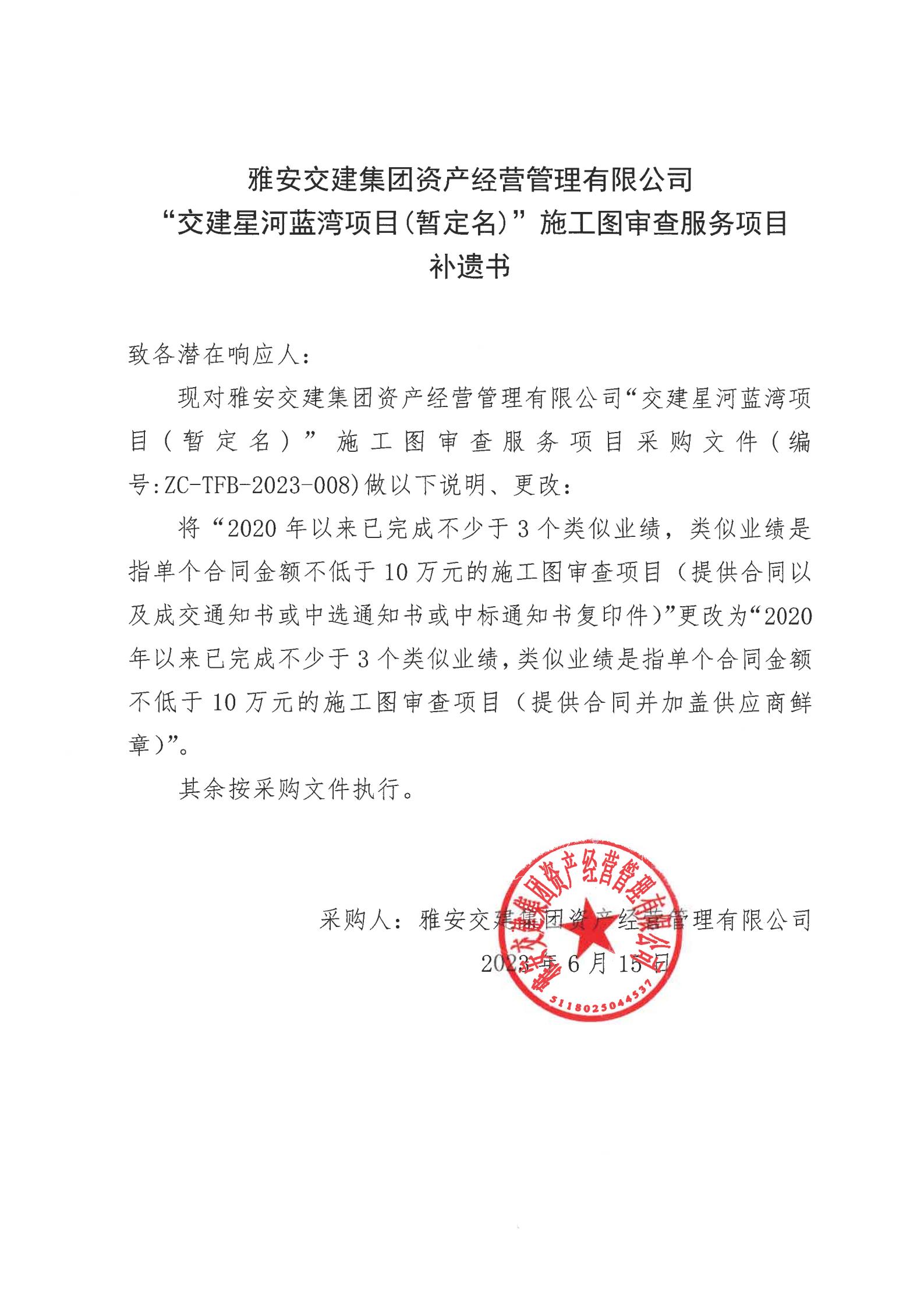 雅安交建集團(tuán)資產(chǎn)經(jīng)營管理有限公司“交建星河藍(lán)灣項目(暫定名)”施工圖審查服務(wù)項目采購補遺書