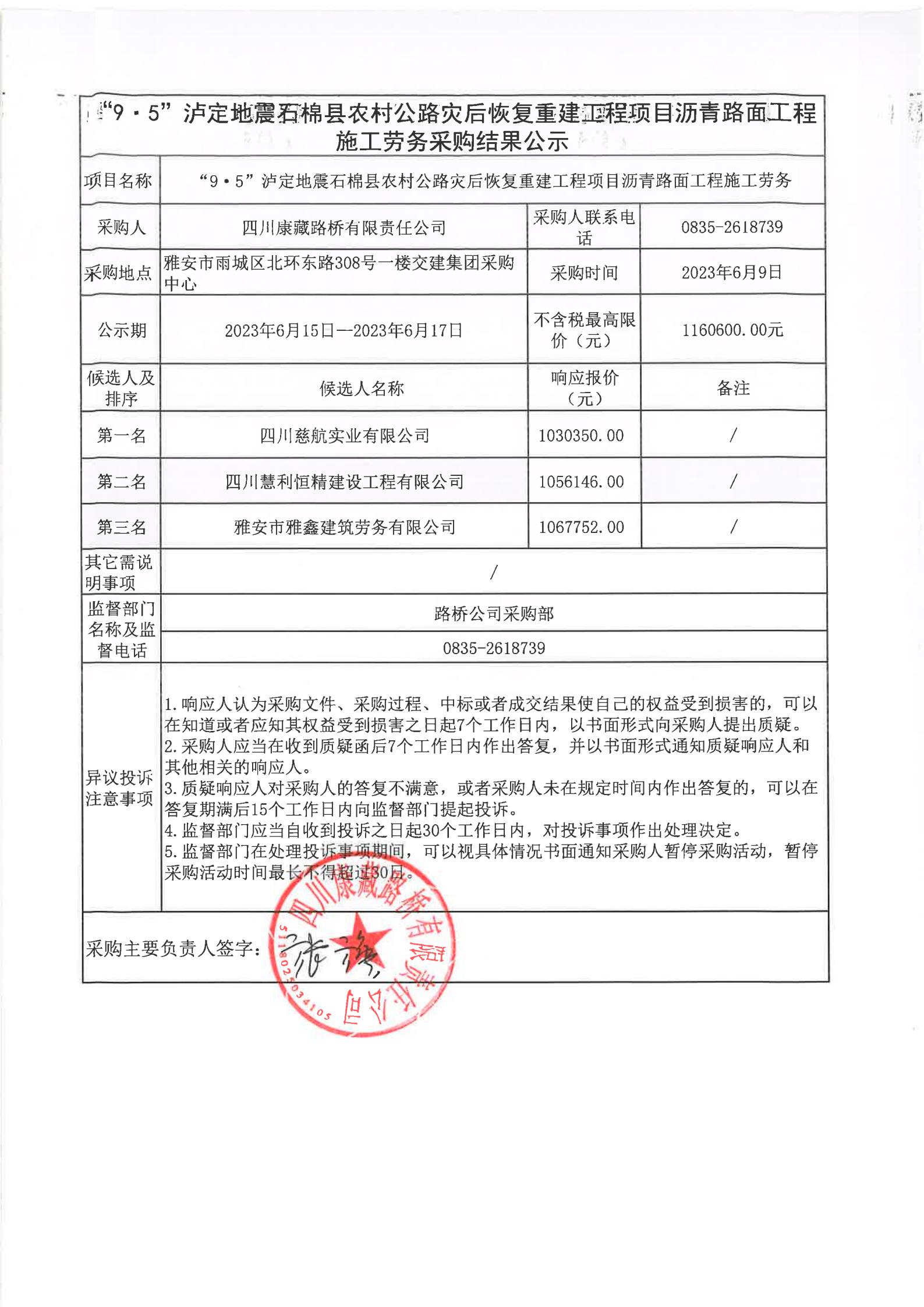 四川康藏路橋有限責任公司“9·5”瀘定地震石棉縣農(nóng)村公路災后恢復重建工程項目混凝土路面工程施工勞務采購(第二次)結果公示