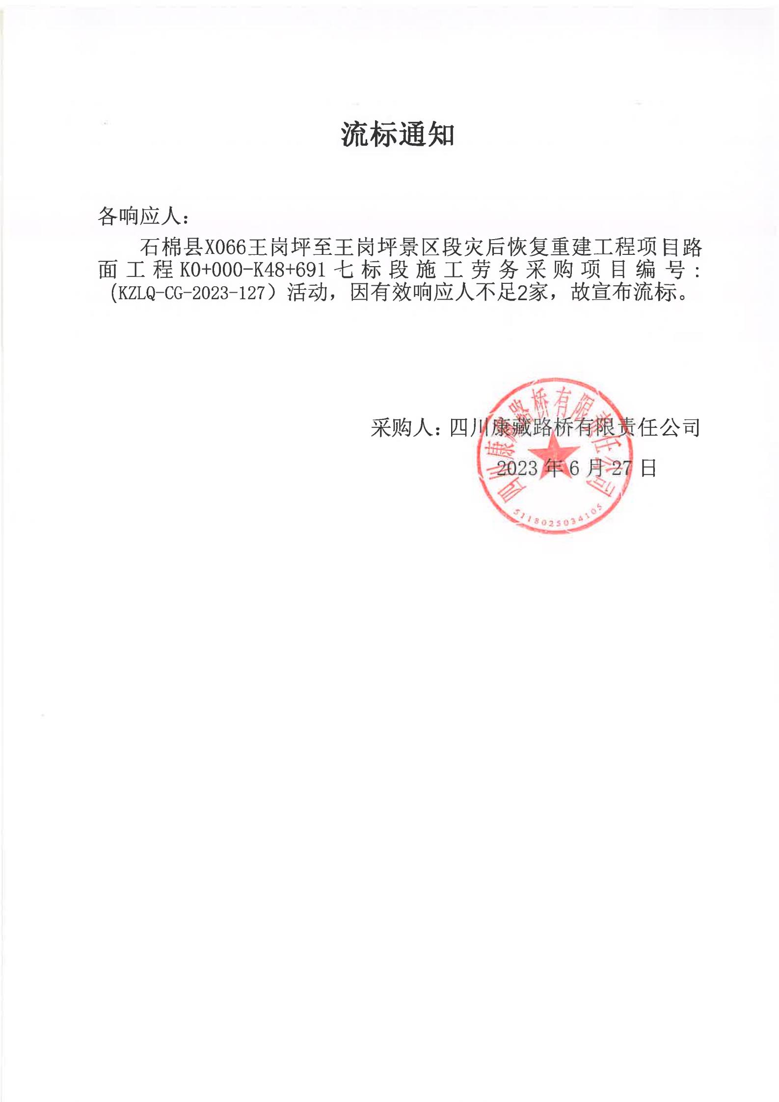 四川康藏路橋有限責任公司石棉縣X066王崗坪至王崗坪景區(qū)段災后恢復重建工程項目路面工程K0+000-K48+691七標段施工勞務采購流標通知