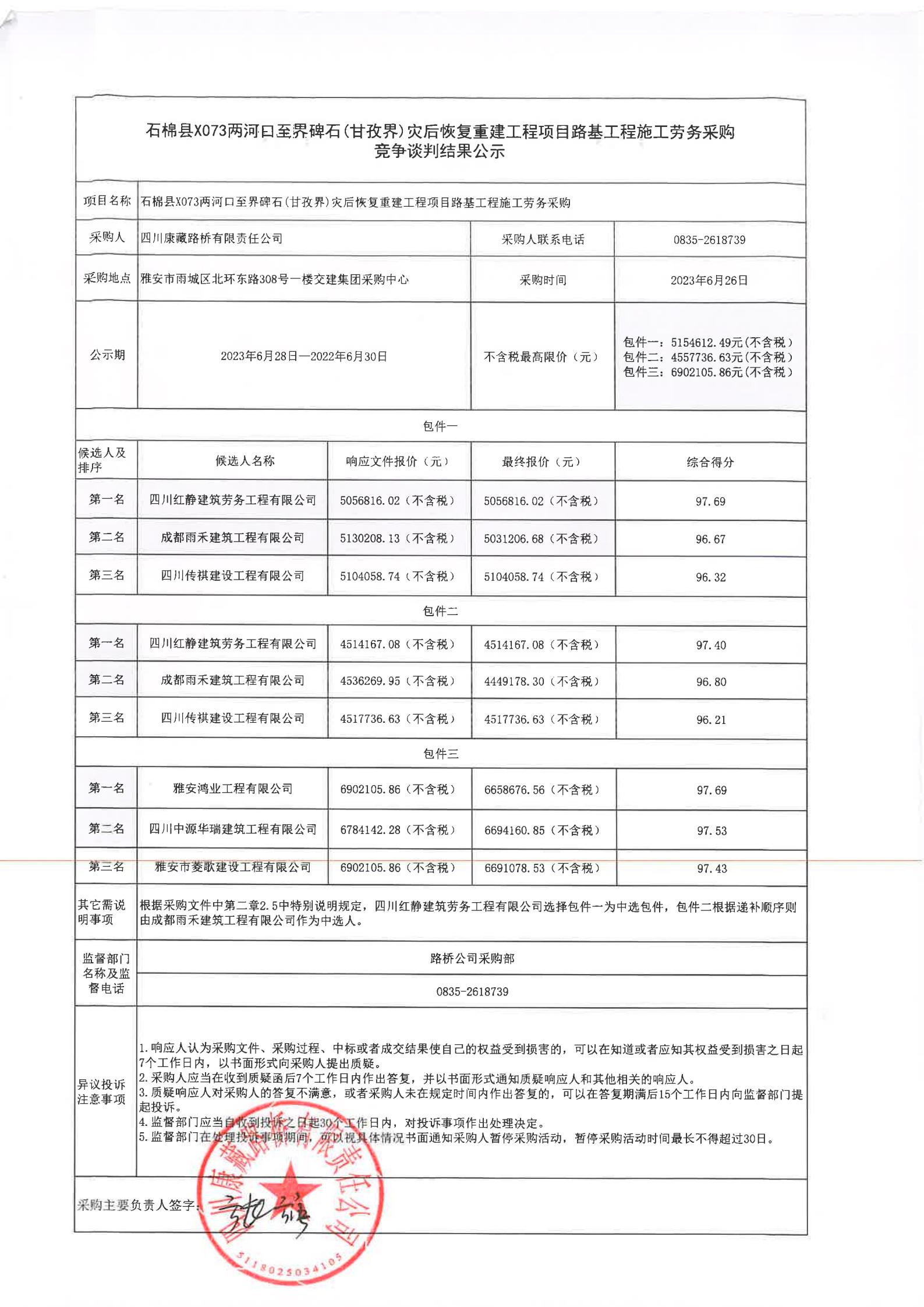 四川康藏路橋有限責(zé)任公司石棉縣X073兩河口至界碑石(甘孜界)災(zāi)后恢復(fù)重建工程項(xiàng)目路基工程施工勞務(wù)采購競爭談判結(jié)果公示