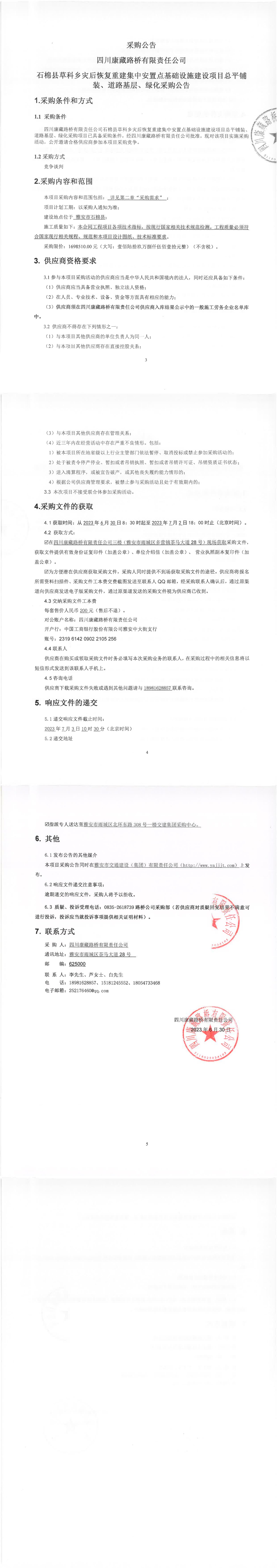 四川康藏路橋有限責任公司石棉縣草科鄉(xiāng)災后恢復重建集中安置點基礎設施建設項目總平鋪裝、道路基層、綠化采購公告