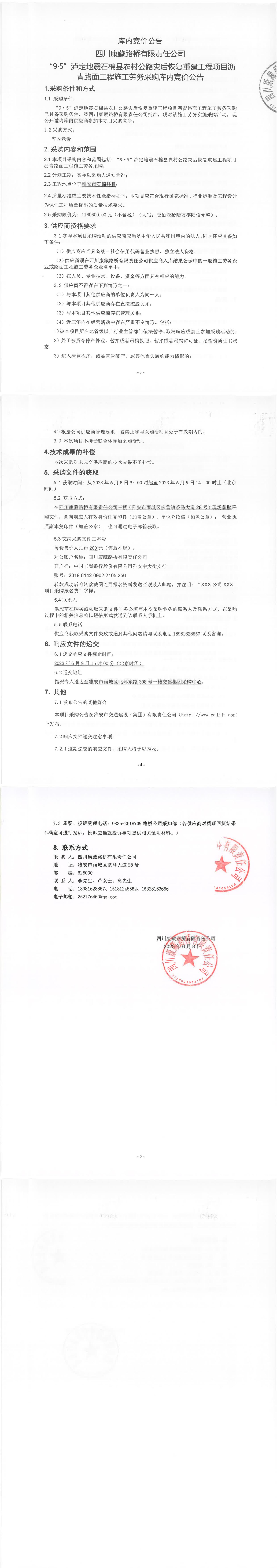 四川康藏路橋有限責任公司“9·5”瀘定地震石棉縣農村公路災后恢復重建工程項目瀝青路面工程施工勞務采購庫內競價公告