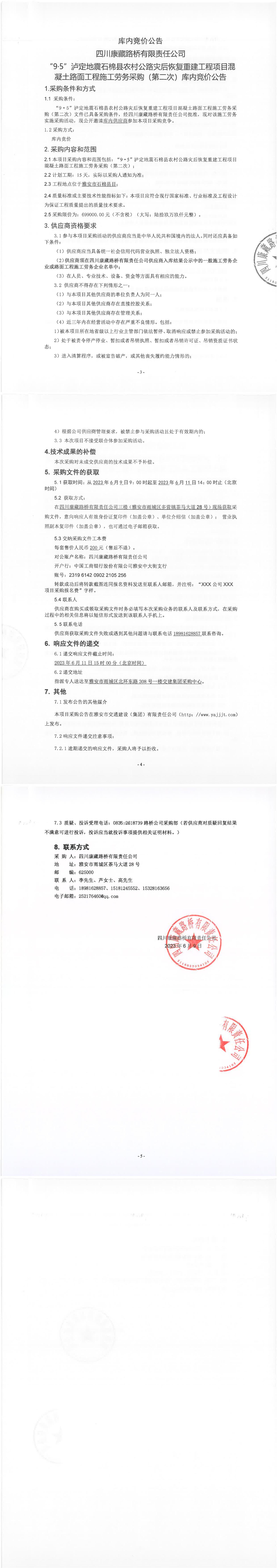四川康藏路橋有限責(zé)任公司“9·5”瀘定地震石棉縣農(nóng)村公路災(zāi)后恢復(fù)重建工程項(xiàng)目混凝土路面工程施工勞務(wù)采購(第二次)庫內(nèi)競(jìng)價(jià)公告
