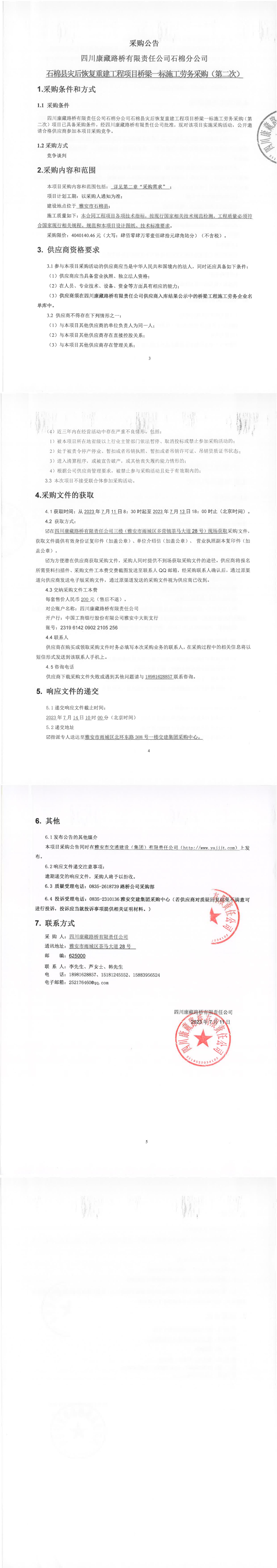 四川康藏路橋有限責任公司石棉縣災后恢復重建工程項目橋梁一標段施工勞務采購(第二次)