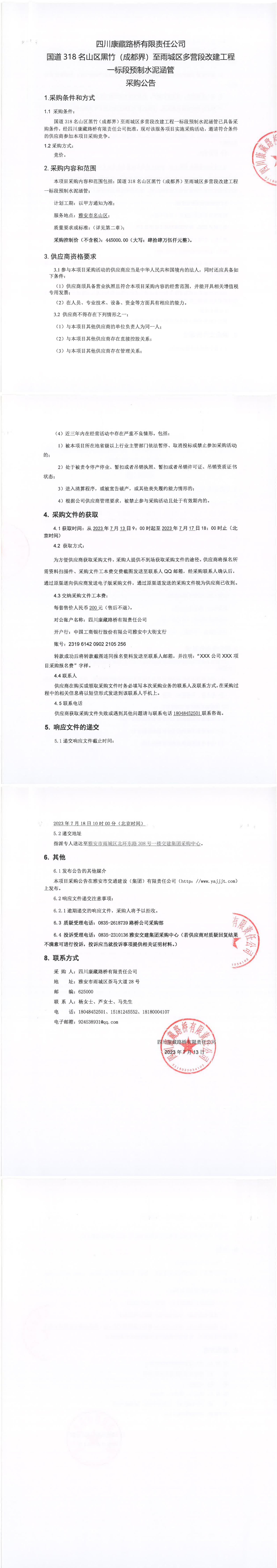 四川康藏路橋有限責任公司國道318名山區(qū)黑竹(成都界)至雨城區(qū)多營段改建工程一標段預(yù)制水泥涵管采購公告