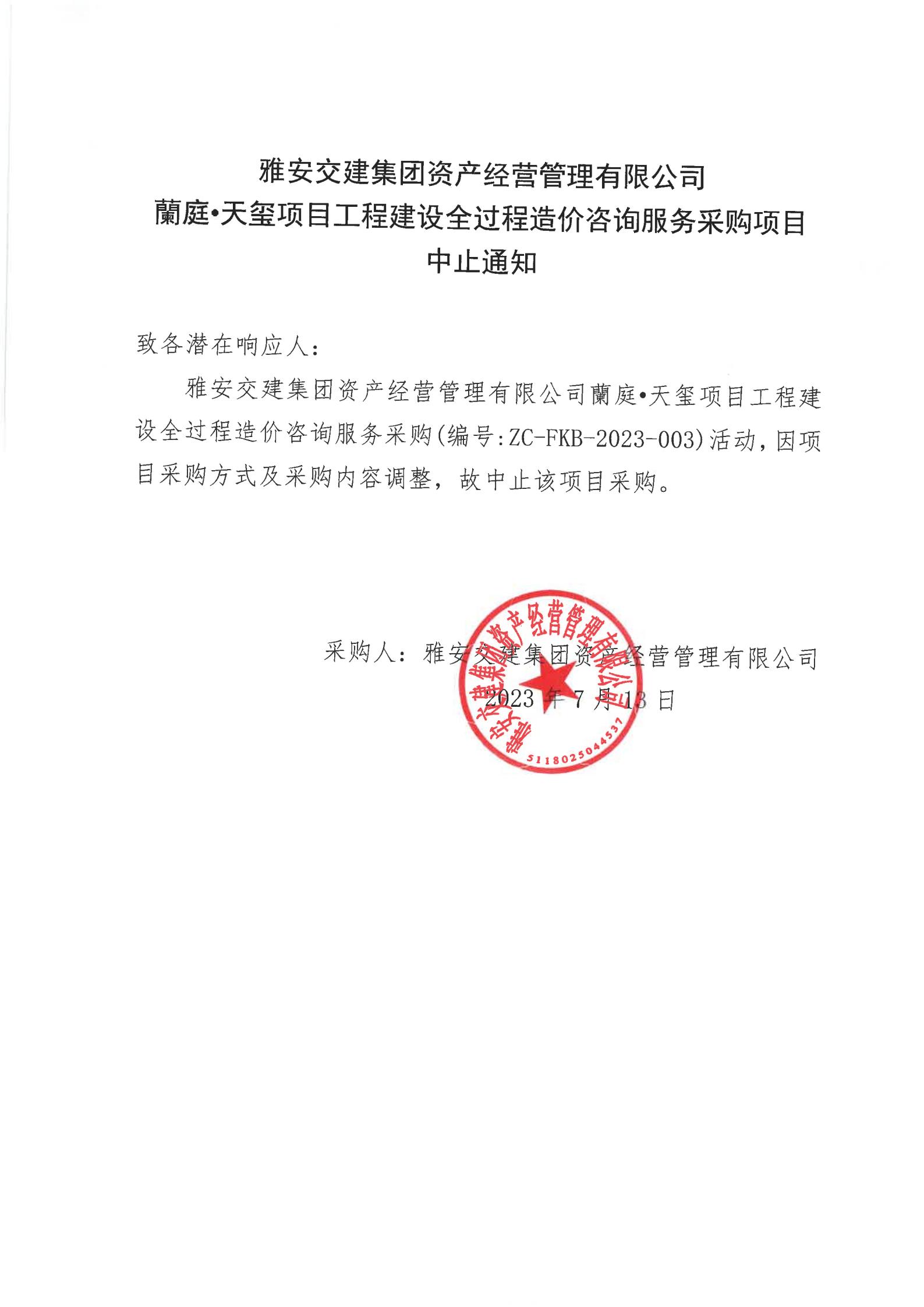 雅安交建集團資產(chǎn)經(jīng)營管理有限公司蘭庭·天璽項目工程建設全過程造價咨詢服務采購項目中止通知
