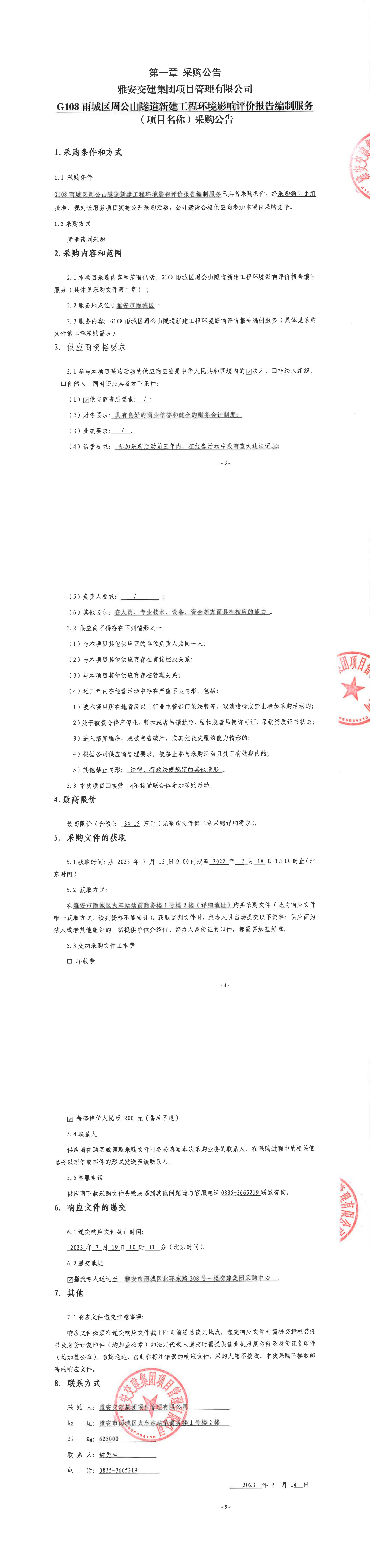 雅安交建集團項目管理有限公司G108雨城區(qū)周公山隧道新建工程環(huán)境影響評價報告編制服務(項目名稱)采購公告
