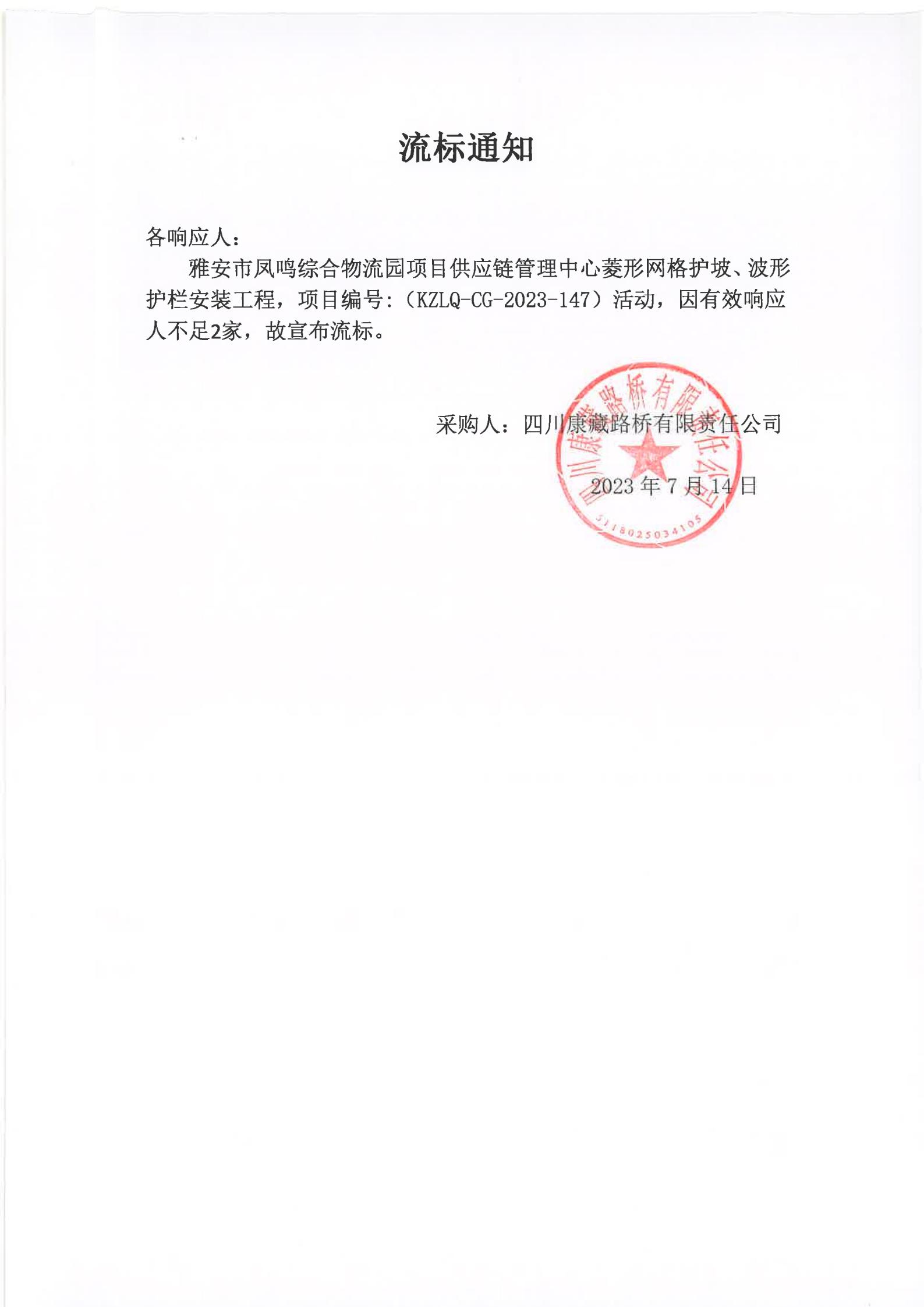 四川康藏路橋有限責(zé)任公司雅安市鳳鳴綜合物流園項目供應(yīng)鏈管理中心菱形網(wǎng)格護坡、波形護欄安裝工程采購流標(biāo)通知