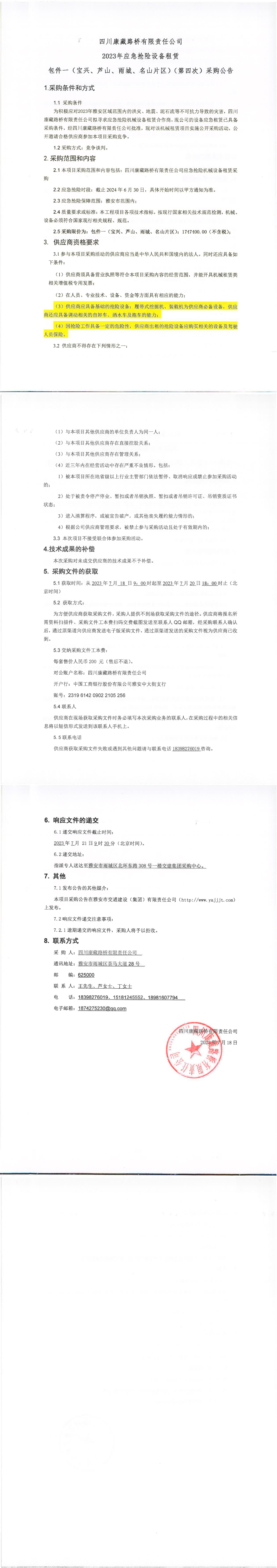四川康藏路橋有限責(zé)任公司2023年應(yīng)急搶險設(shè)備租賃包件一(寶興、蘆山、雨城、名山片區(qū))(第四次)采購公告