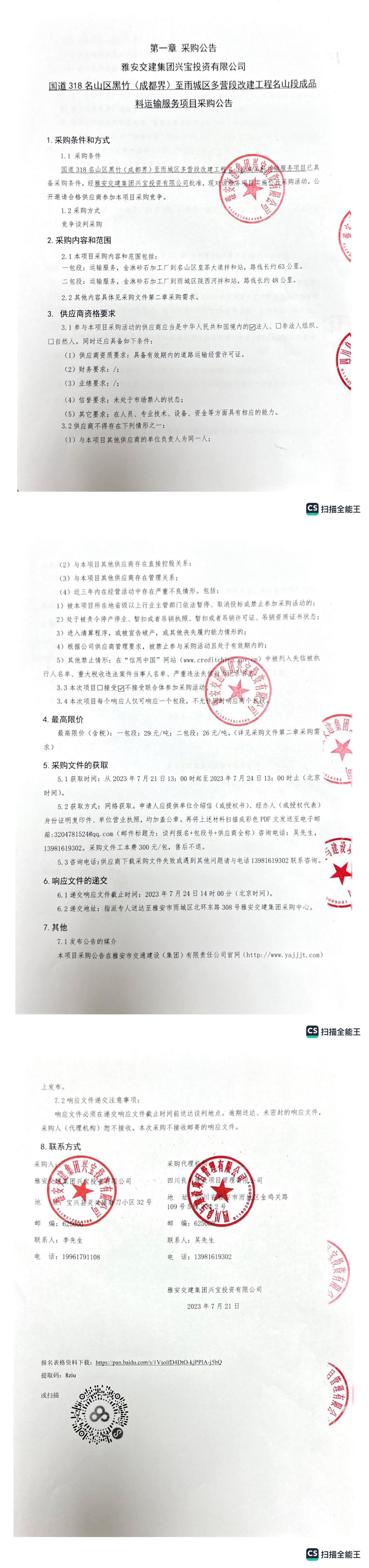 雅安交建集團興寶投資有限公司國道318名山區(qū)黑竹(成都界)至雨城區(qū)多營段改建工程名山段成品料運輸服務(wù)項目采購公告