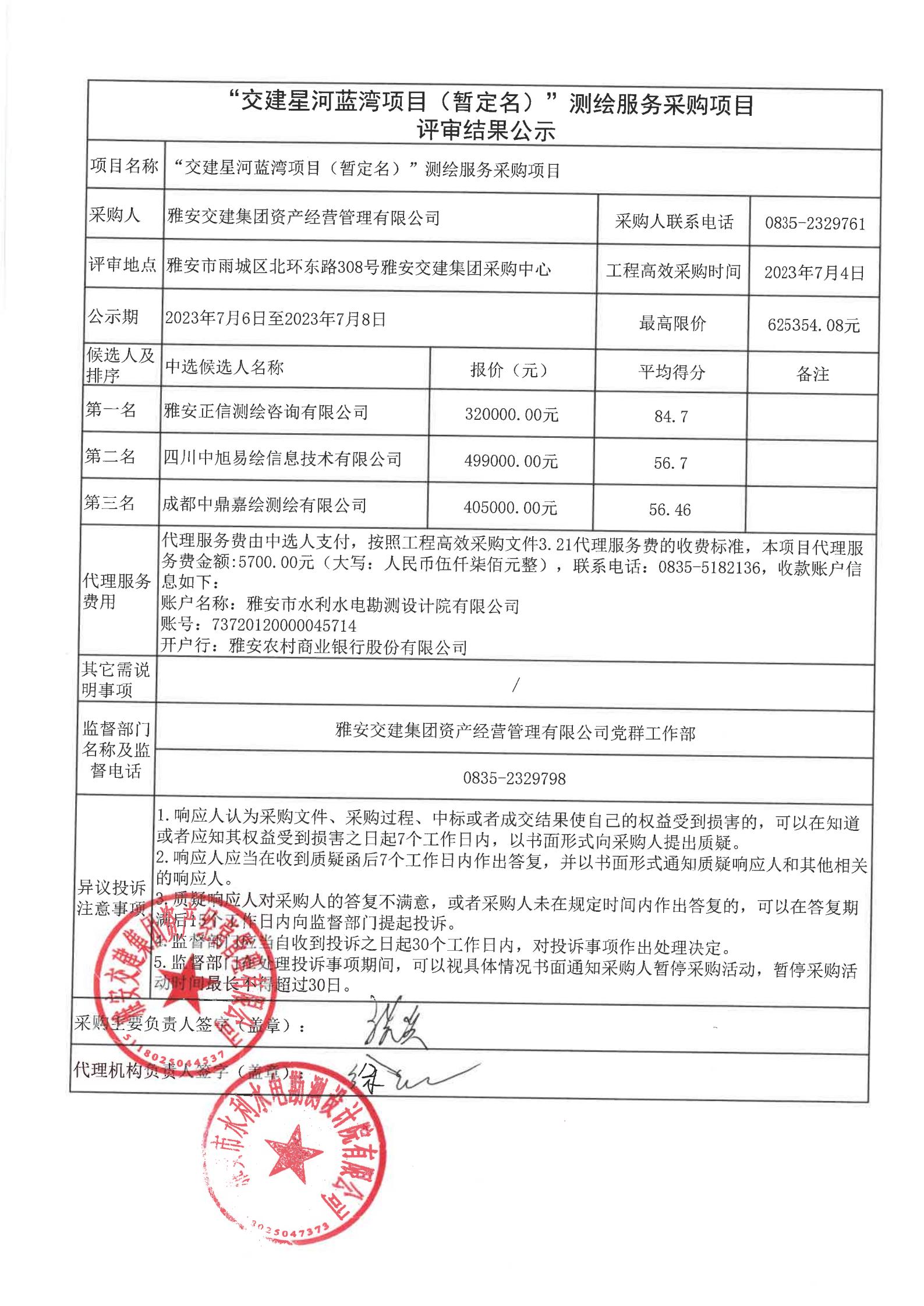 雅安交建集團(tuán)資產(chǎn)經(jīng)營管理有限公司“交建星河藍(lán)灣項目(暫定名)”測繪服務(wù)采購項目評審結(jié)果公示
