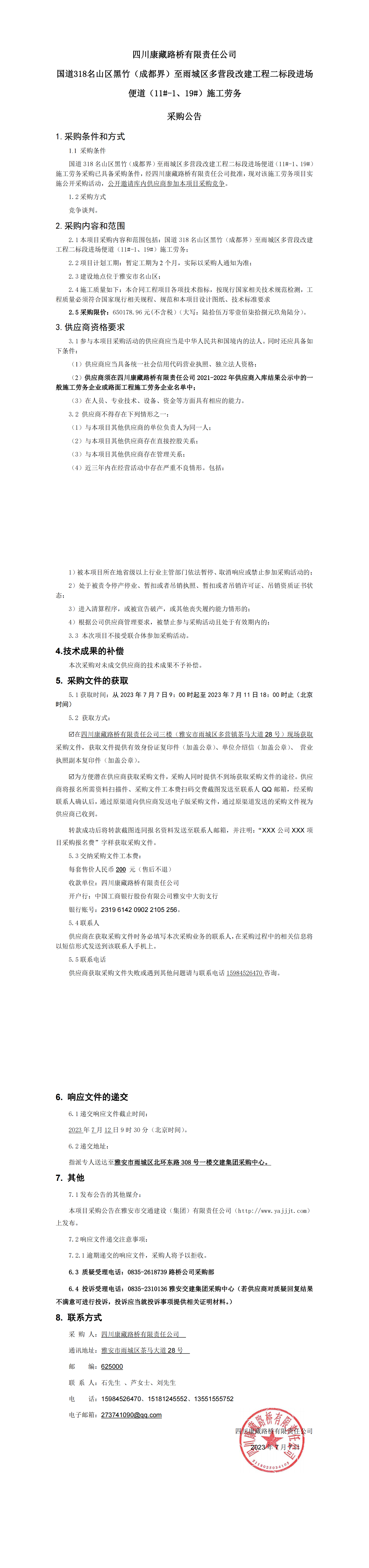 四川康藏路橋有限責(zé)任公司國道318名山區(qū)黑竹(成都界)至雨城區(qū)多營段改建工程二標(biāo)段進(jìn)場(chǎng)便道(11#-1、19#)施工勞務(wù)采購公告
