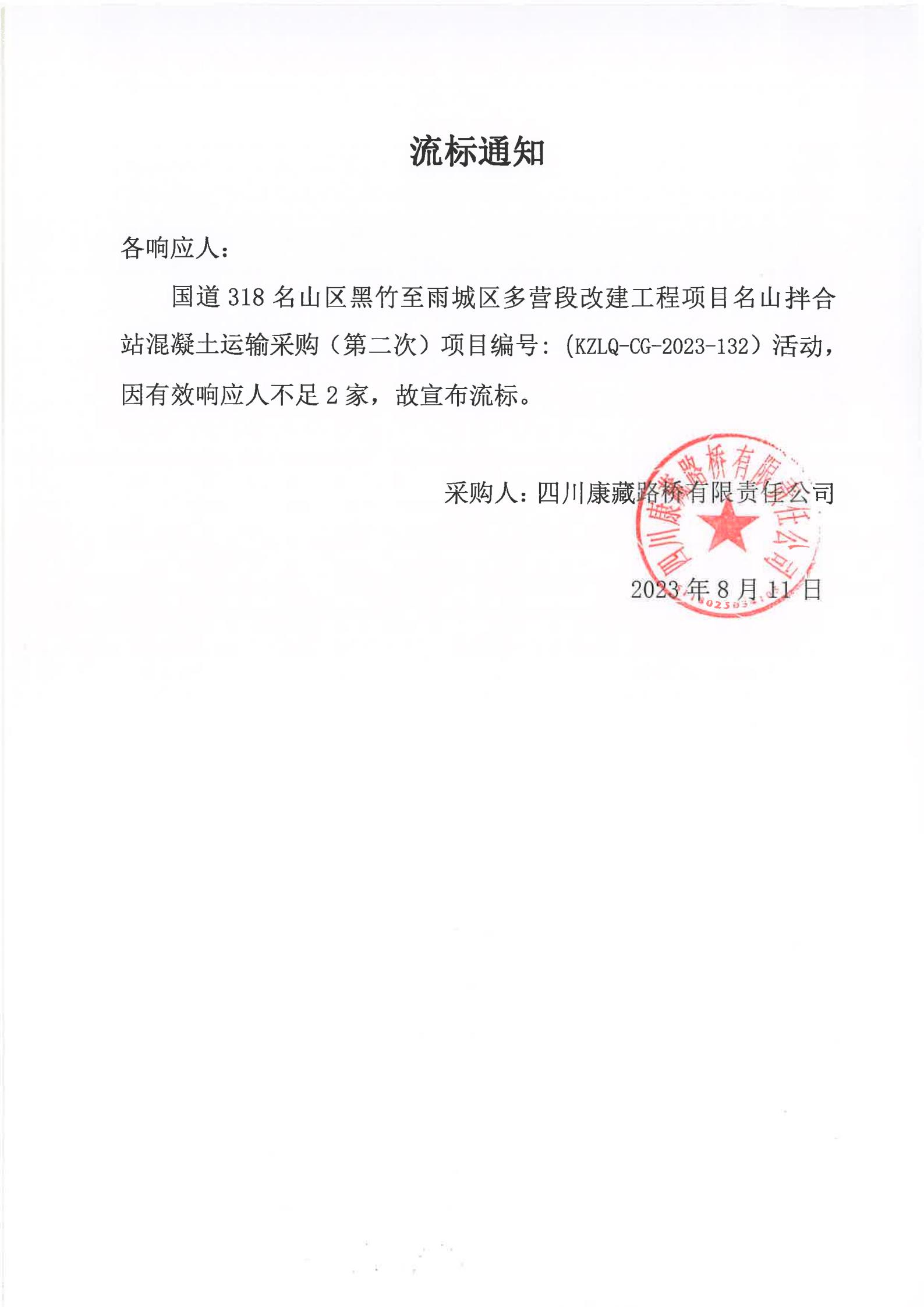 四川康藏路橋有限責(zé)任公司國道318名山區(qū)黑竹至雨城區(qū)多營段改建工程項目名山拌合站混凝土運(yùn)輸服務(wù)(第二次)流標(biāo)通知)