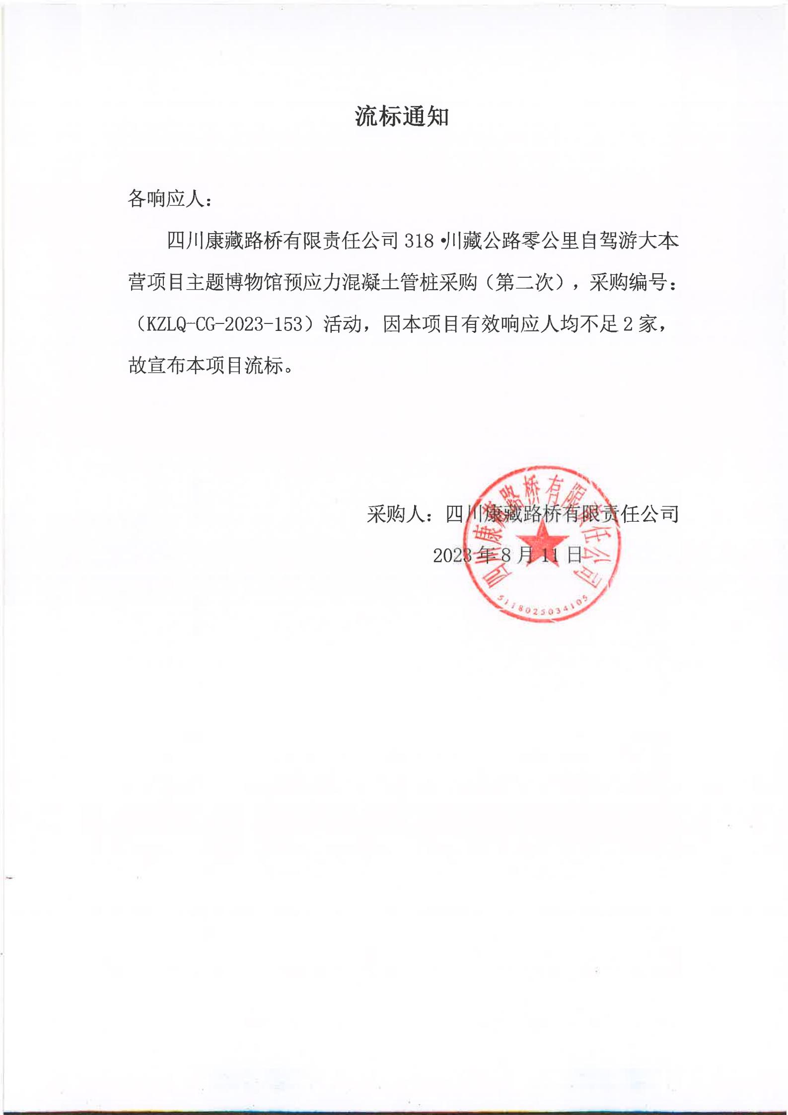 四川康藏路橋有限責任公司318·川藏公路零公里自駕游大本營項目主題博物館預應力混凝土管樁采購(第二次)流標通知