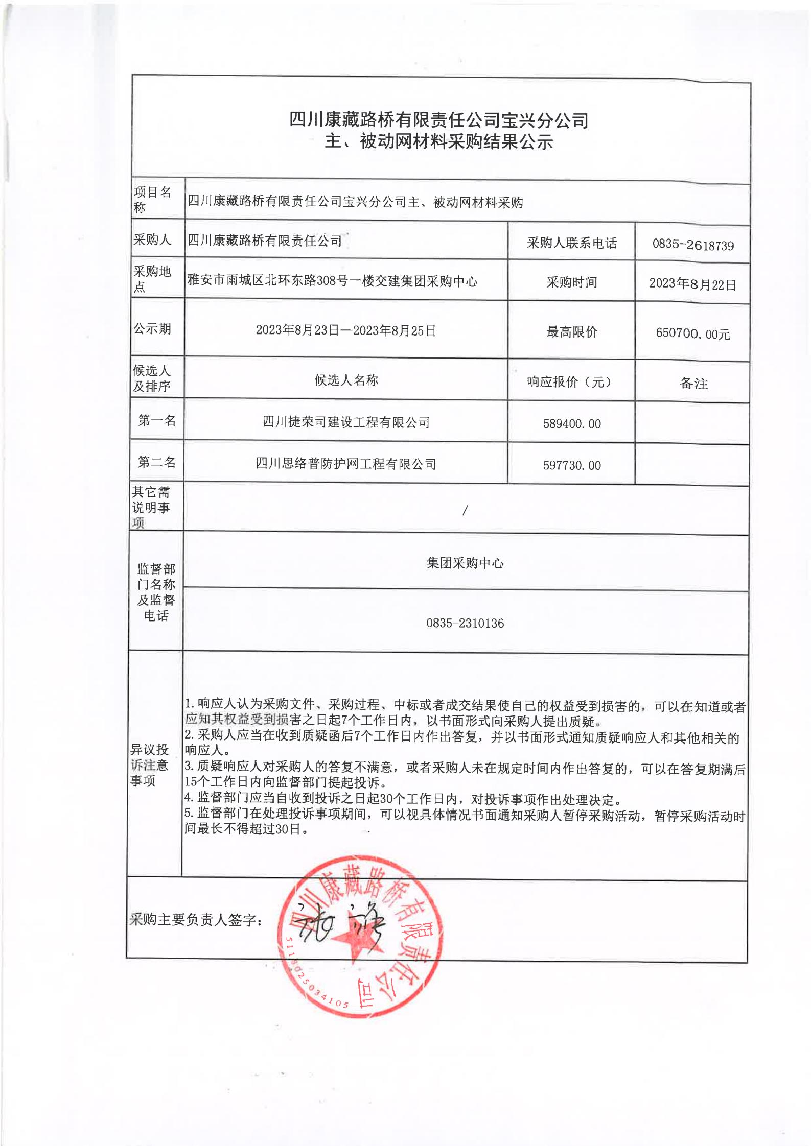 四川康藏路橋有限責(zé)任公司寶興分公司主、被動(dòng)網(wǎng)材料采購結(jié)果公示
