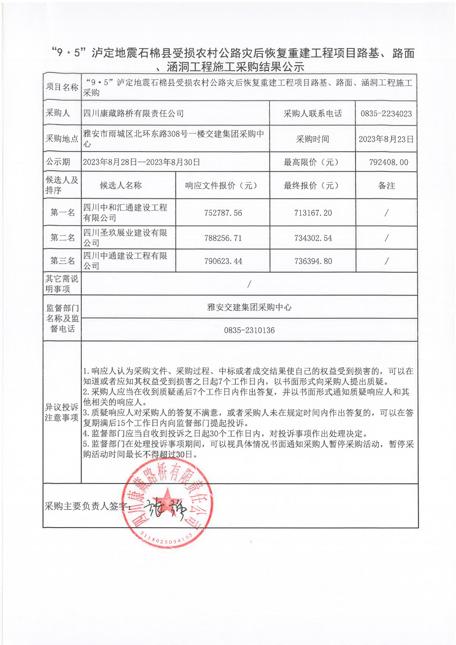四川康藏路橋有限責任公司“9·5”瀘定地震石棉縣受損農(nóng)村公路災(zāi)后恢復(fù)重建工程項目路基、路面、涵洞工程施工采購結(jié)果公示