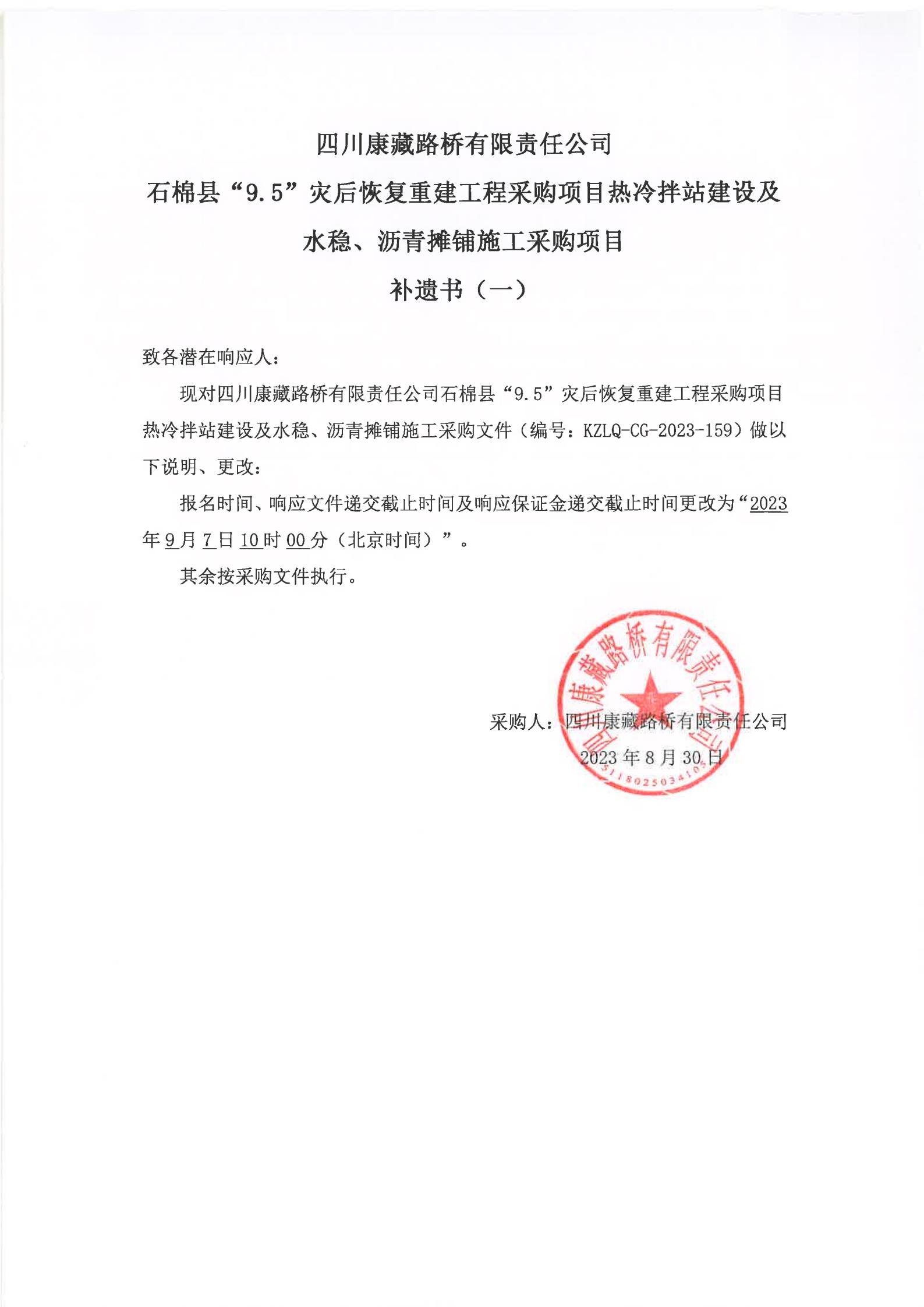 四川康藏路橋有限責任公司石棉縣“9·5”災后恢復重建工程采購項目熱冷拌站建設及水穩(wěn)、瀝青攤鋪施工采購項目補遺書(一)