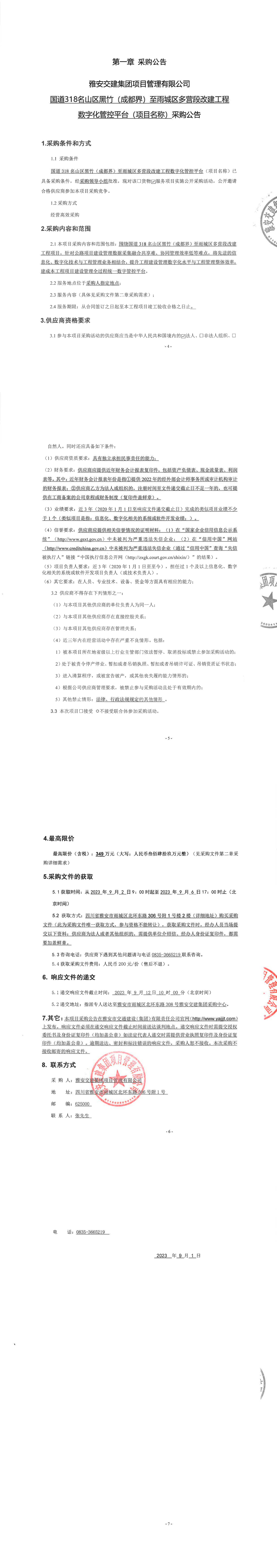 雅安交建集團(tuán)項(xiàng)目管理有限公司國道318名山區(qū)黑竹(成都界)至雨城區(qū)多營段改建工程數(shù)字化管控平臺(項(xiàng)目名稱)采購公告