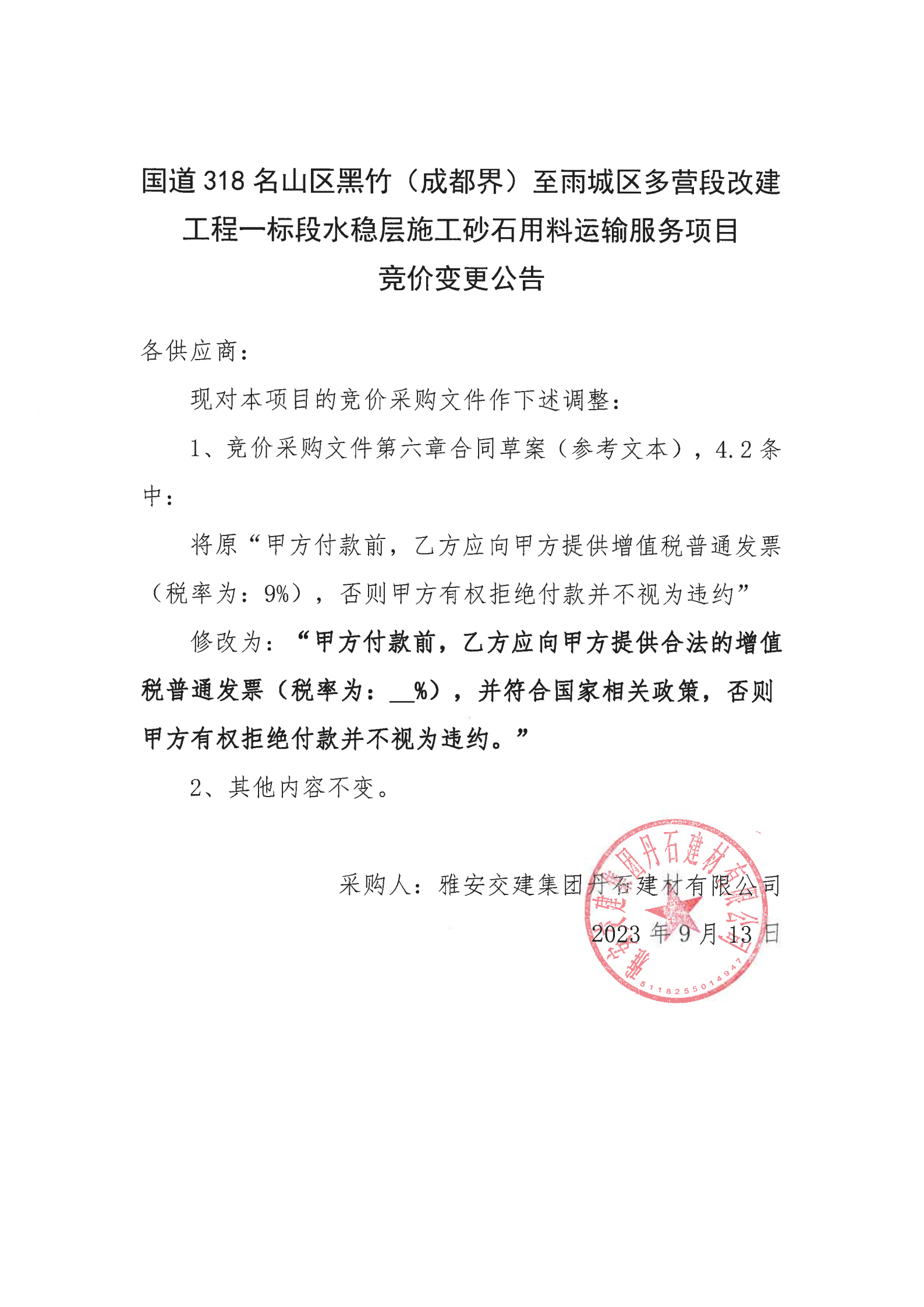 雅安交建集團(tuán)丹石建材有限公司國道318名山區(qū)黑竹(成都界)至雨城區(qū)多營段改建工程一標(biāo)段水穩(wěn)層施工砂石用料運(yùn)輸服務(wù)項(xiàng)目競價(jià)變更公告