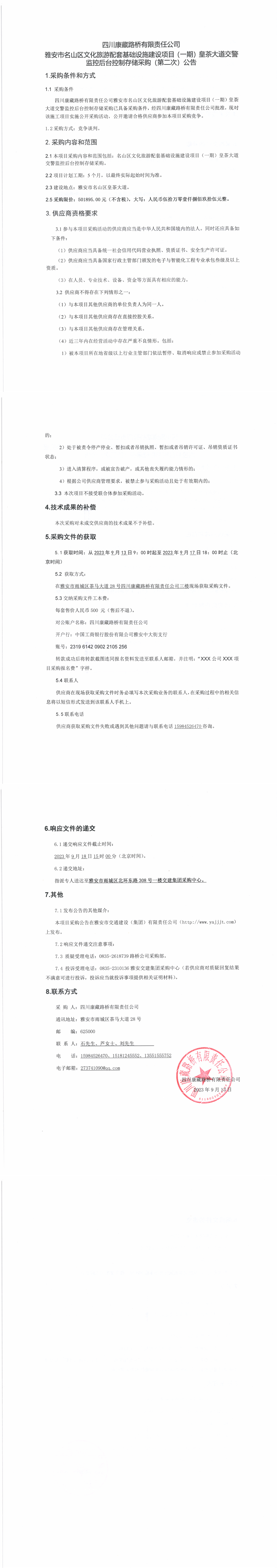 四川康藏路橋有限責(zé)任公司雅安市名山區(qū)文化旅游配套基礎(chǔ)設(shè)施建設(shè)項(xiàng)目(一期)皇茶大道交警監(jiān)控后臺(tái)控制存儲(chǔ)采購(gòu)(第二次)公告