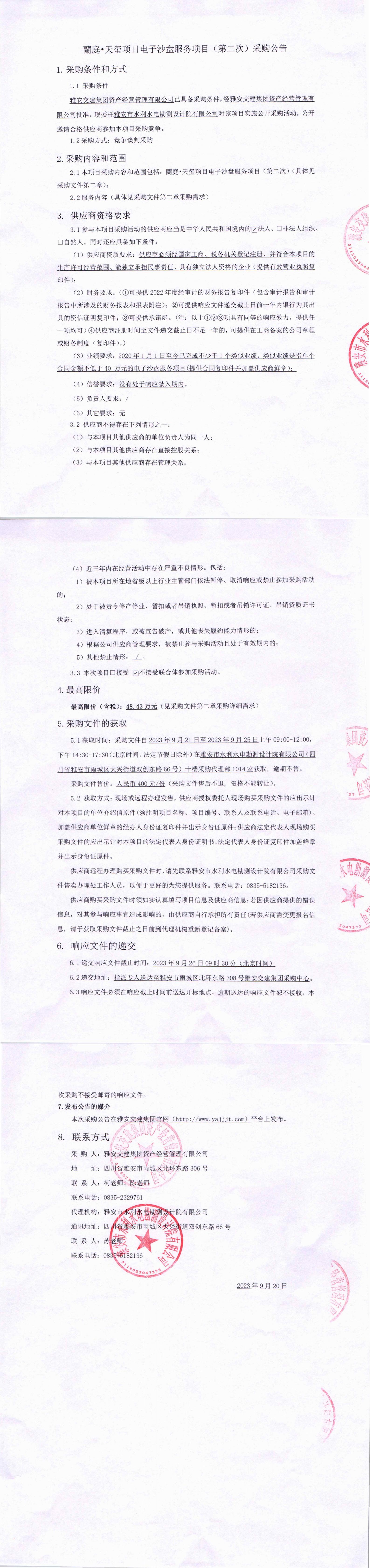 雅安交建集團資產經營管理有限公司蘭庭·天璽項目電子沙盤服務項目(第二次)采購公告