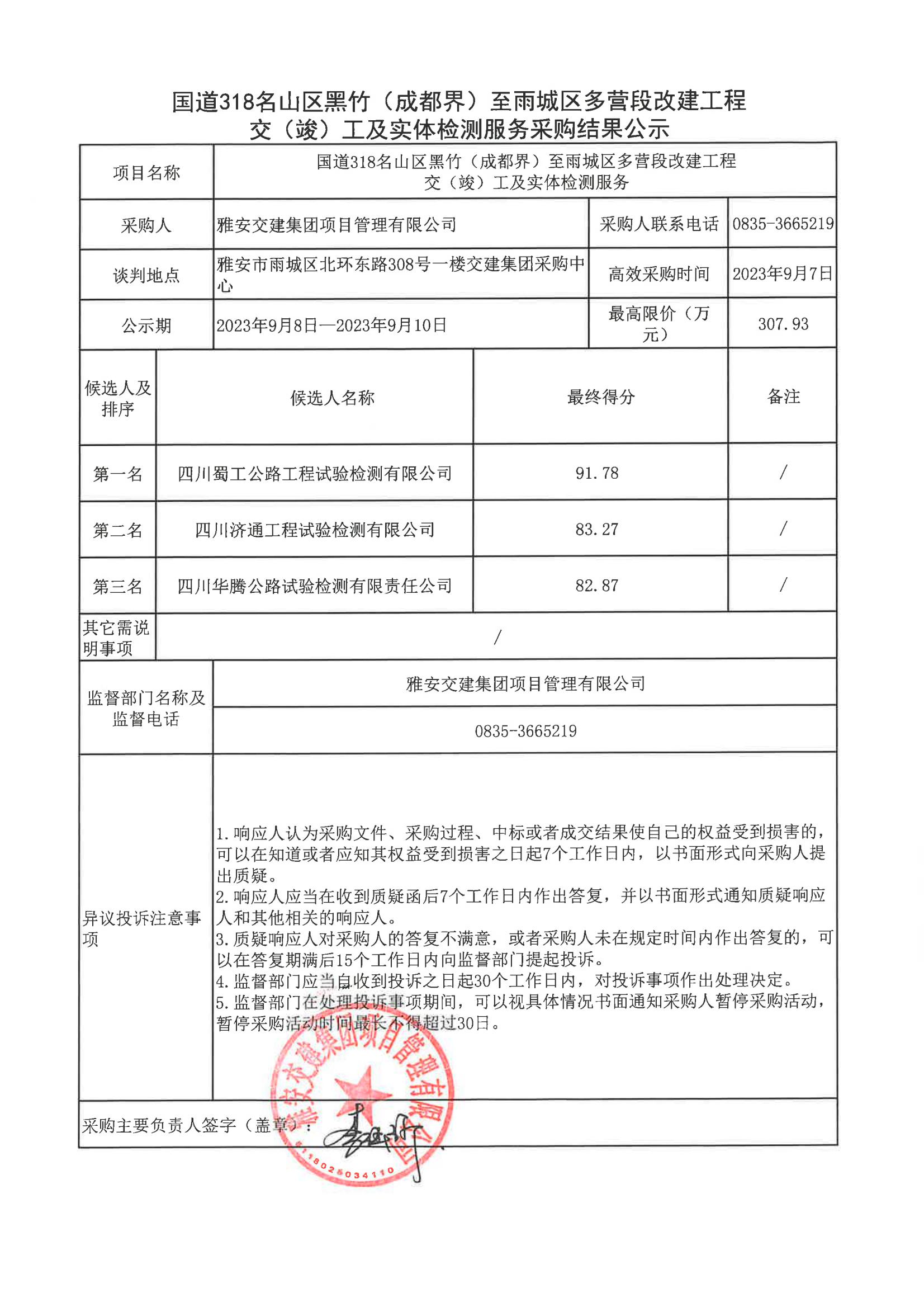雅安交建集團(tuán)項(xiàng)目管理有限公司國(guó)道318名山區(qū)黑竹(成都界)至雨城區(qū)多營(yíng)段改建工程交(竣)工及實(shí)體檢測(cè)服務(wù)采購(gòu)結(jié)果公示