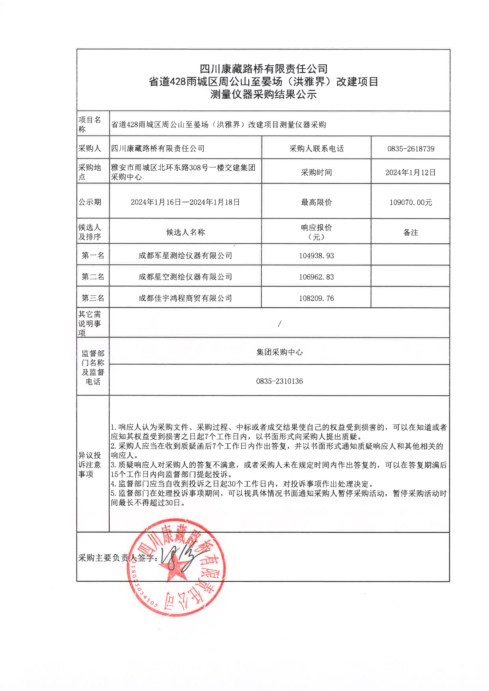 四川康藏路橋有限責任公省道428雨城區(qū)周公山至晏場(洪雅界)改建項目測量儀器采購結(jié)果公示