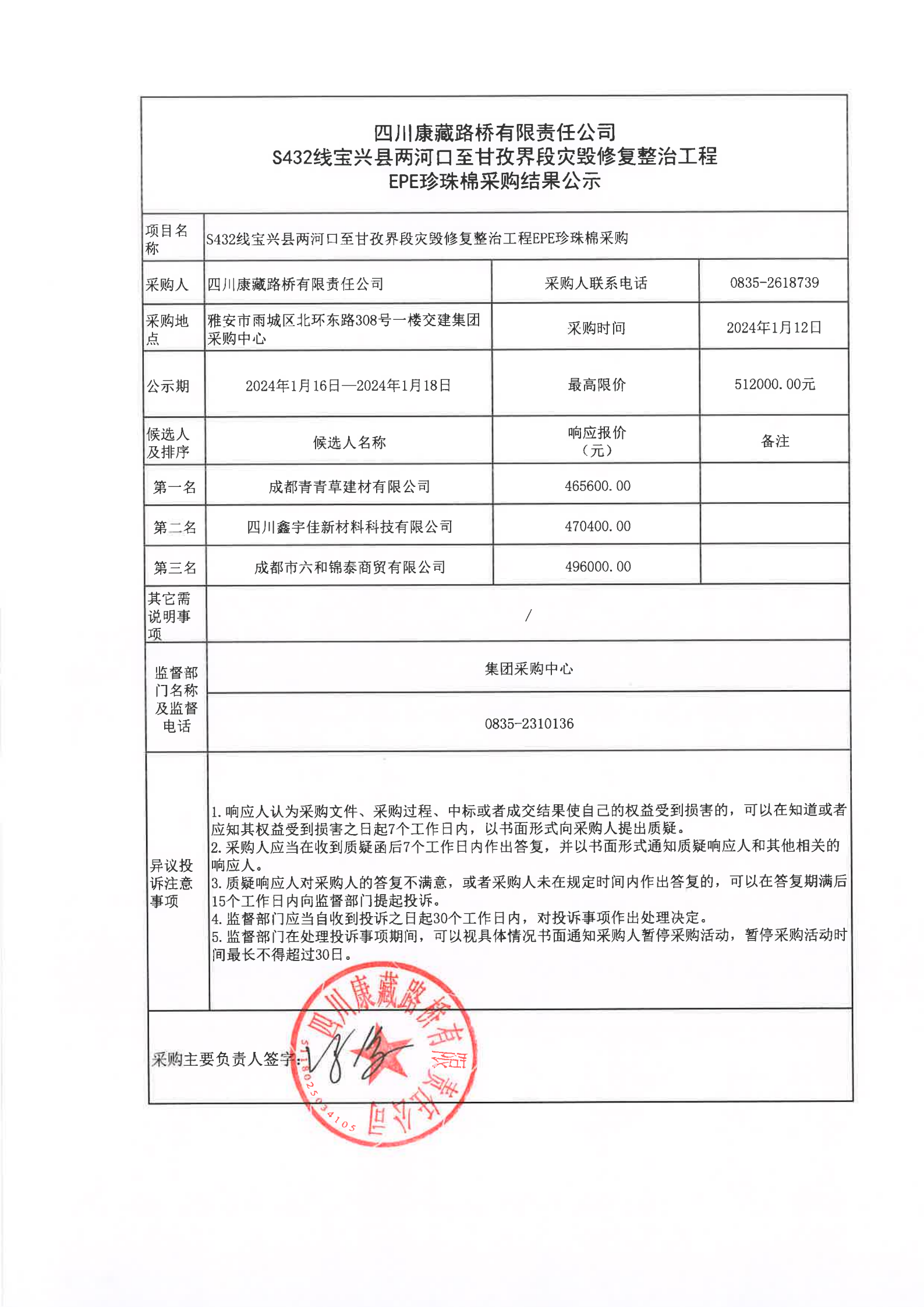 四川康藏路橋有限責(zé)任公司S432線寶興縣兩河口至甘孜界段災(zāi)毀修復(fù)整治工程EOE珍珠棉采購結(jié)果公示