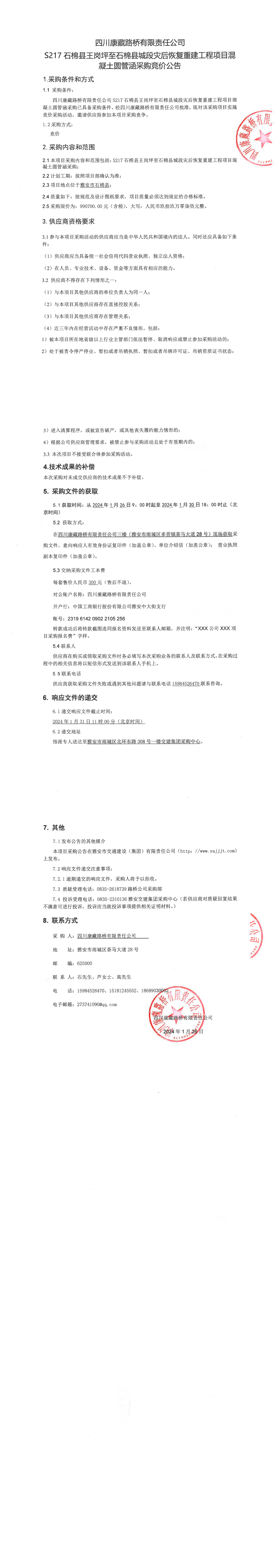 四川康藏路橋有限責(zé)任公司S217石棉縣王崗坪至石棉縣城段災(zāi)后恢復(fù)重建工程項(xiàng)目混凝土圓管涵采購(gòu)競(jìng)價(jià)公告