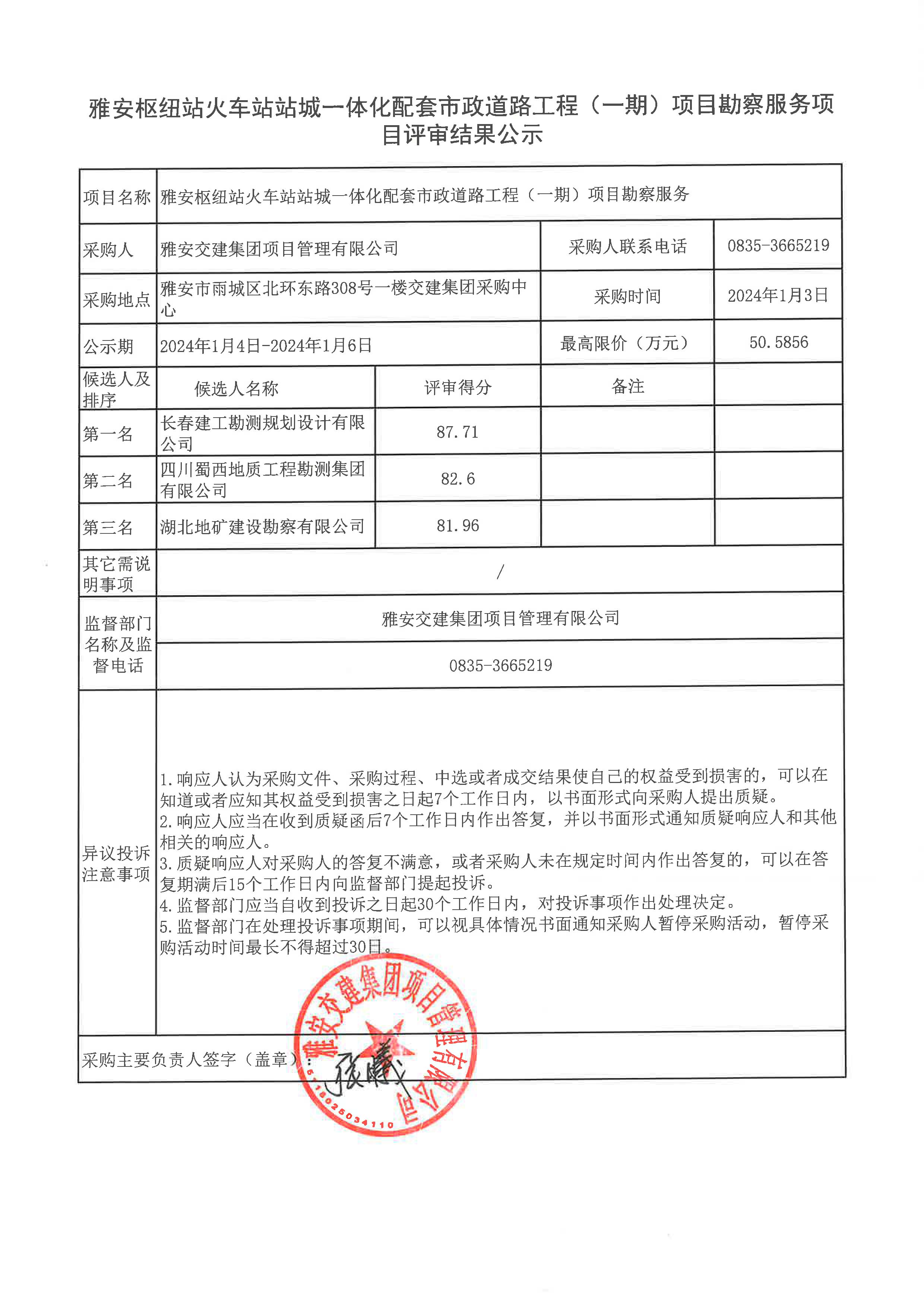 雅安交建集團(tuán)項(xiàng)目管理有限公司雅安樞紐站火車站站城一體化配套市政道路工程(一期) 項(xiàng)目勘察服務(wù)項(xiàng)目評審結(jié)果公示