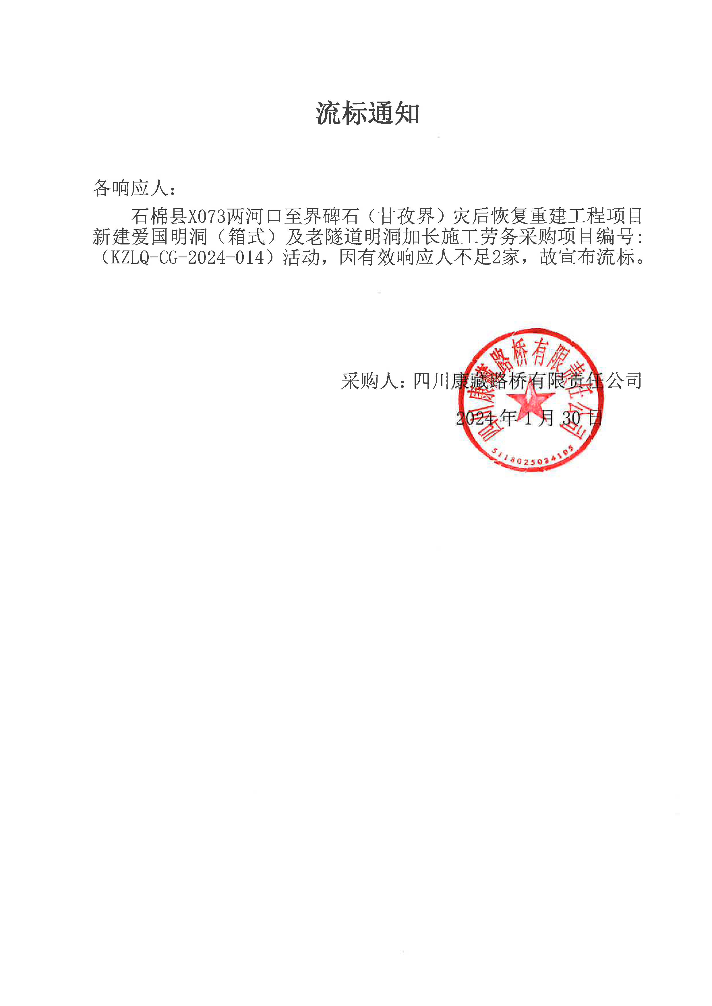 四川康藏路橋有限責(zé)任公司石棉縣X073兩河口至界碑石 (甘孜界)災(zāi)后恢復(fù)重建工程項(xiàng)目新建愛(ài)國(guó)明洞(箱式)及老隧道明洞加長(zhǎng)施工勞務(wù)流標(biāo)通知