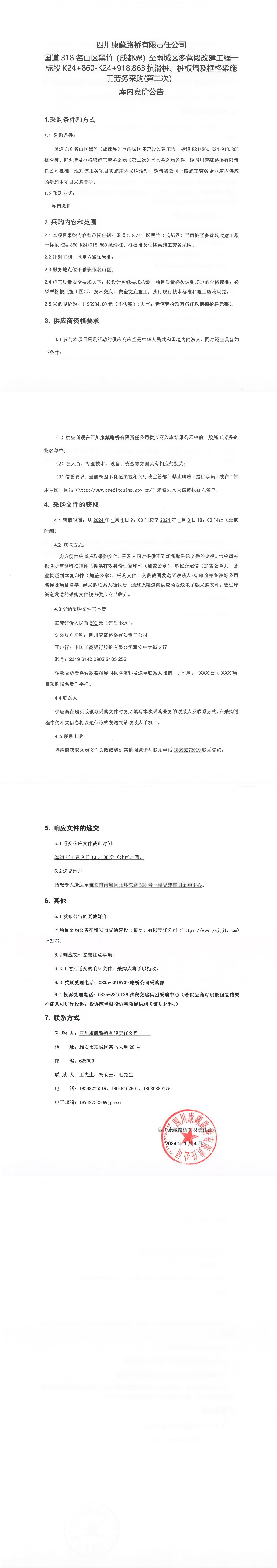 四川康藏路橋有限責(zé)任公司國道318名山區(qū)黑竹(成都界)至雨城區(qū)多營段改建工程一標(biāo)段K24+860-K24+918.863抗滑樁、樁板墻及框格梁施工勞務(wù)采購(第二次)庫內(nèi)競價公告
