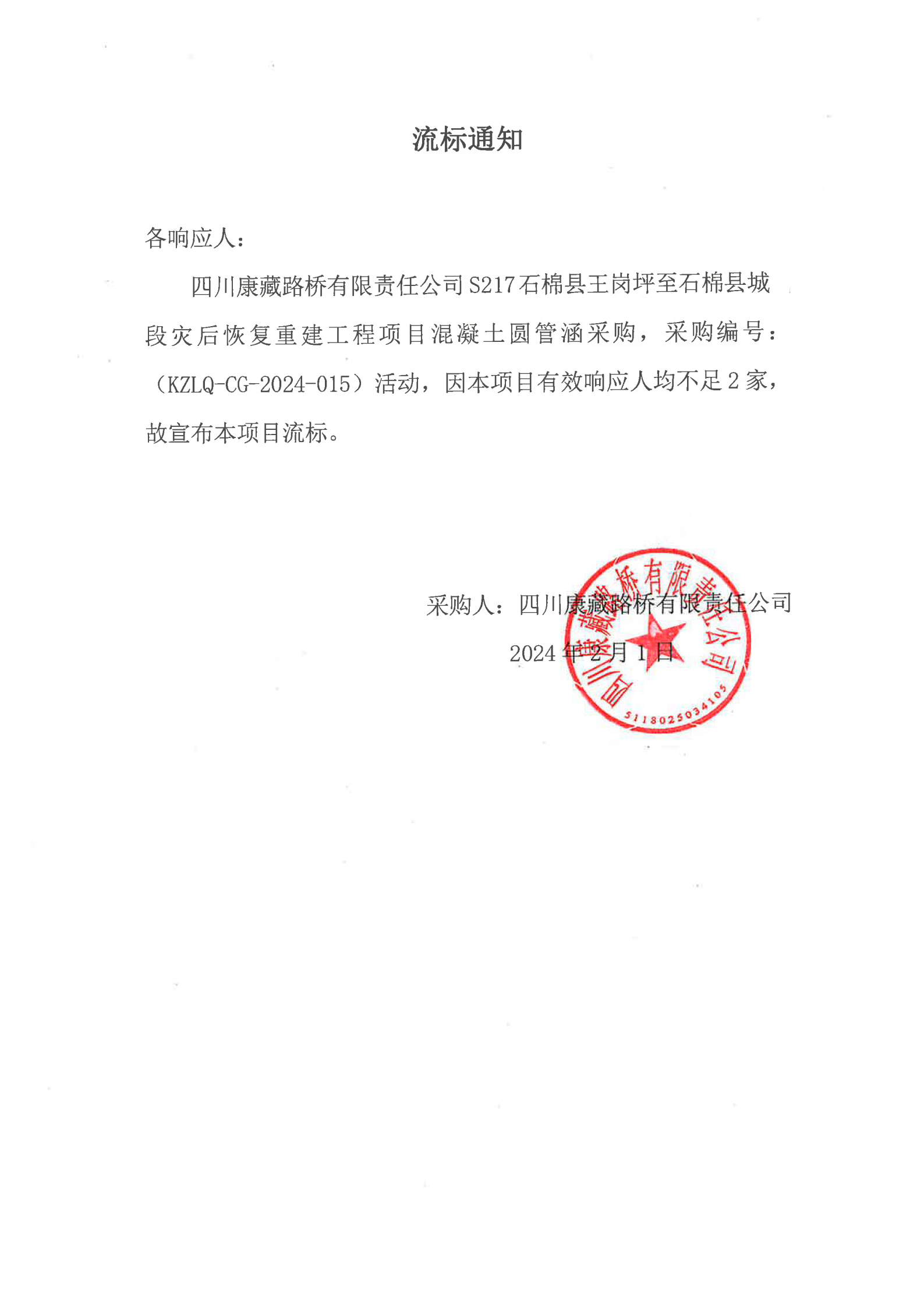 四川康藏路橋有限責(zé)任公司S217石棉縣王崗坪至石棉縣城段災(zāi)后恢復(fù)重建工程項(xiàng)目混凝土圓管涵采購流標(biāo)通知