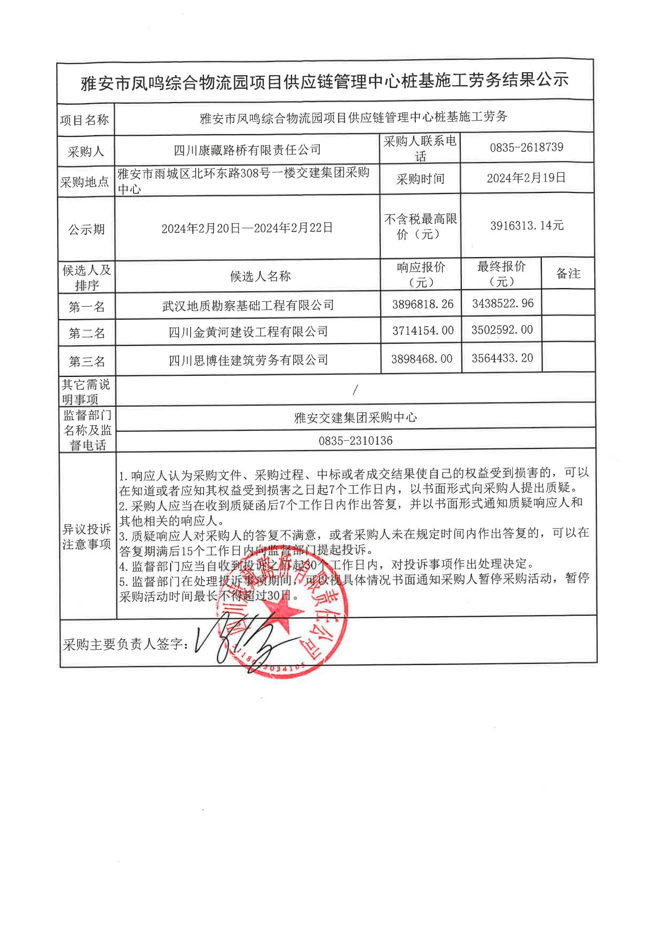 四川康藏路橋有限責(zé)任公司雅安市鳳鳴綜合物流園項(xiàng)目供應(yīng)鏈管理中心樁基施工勞務(wù)結(jié)果公示