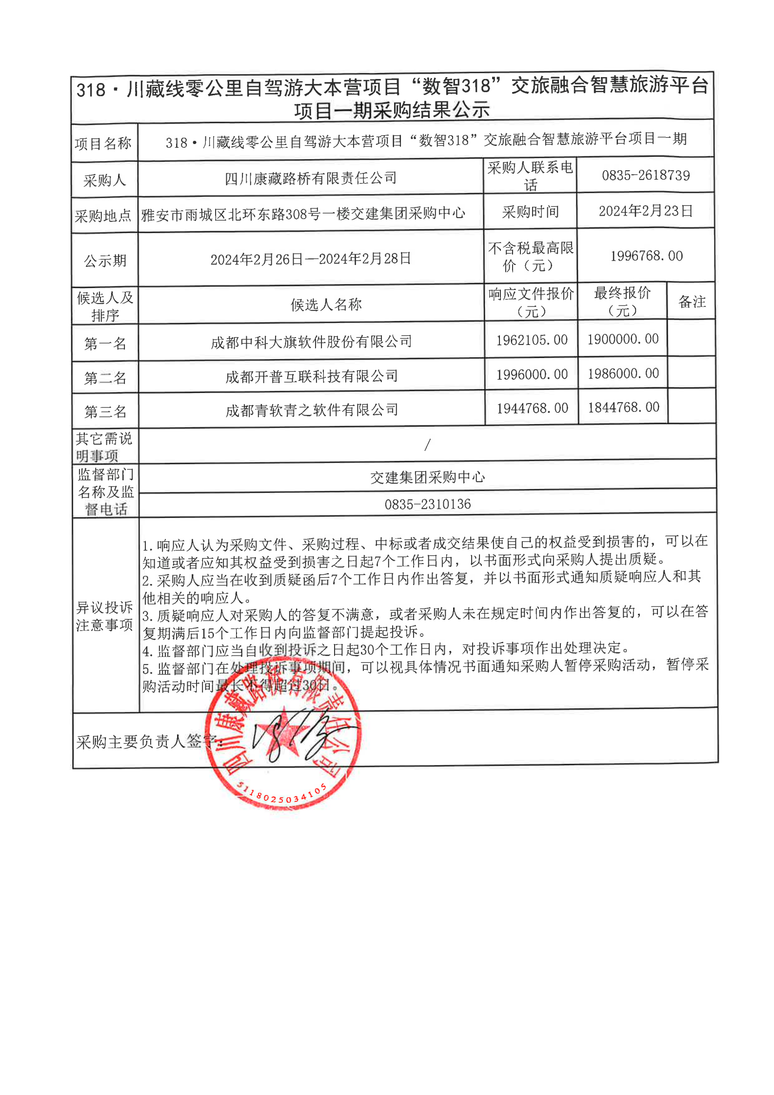 四川康藏路橋有限責(zé)任公司318·川藏公路零公里自駕游大本營項(xiàng)目“數(shù)智318”交旅融合智慧旅游平臺(tái)項(xiàng)目一期采購結(jié)果公示