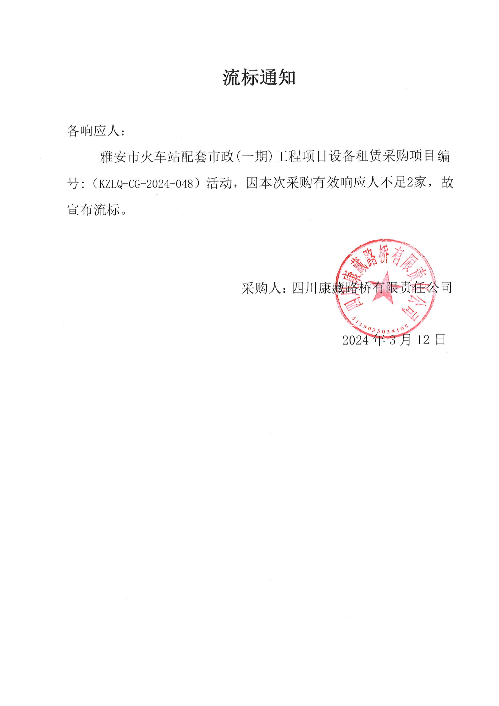 四川康藏路橋有限責(zé)任公司雅安市火車(chē)站配套市政(一期)工程項(xiàng)目設(shè)備租賃采購(gòu)流標(biāo)通知