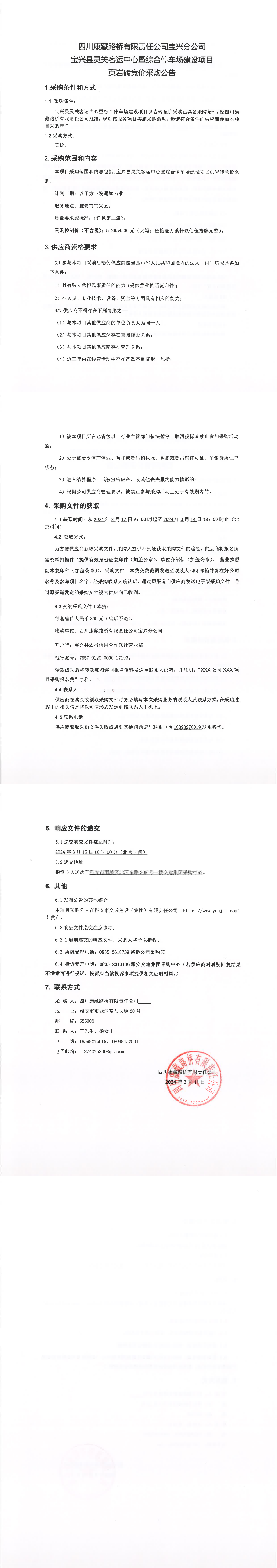 四川康藏路橋有限責任公司寶興縣靈關客運中心暨綜合停車場建設項目頁巖磚競價采購公告