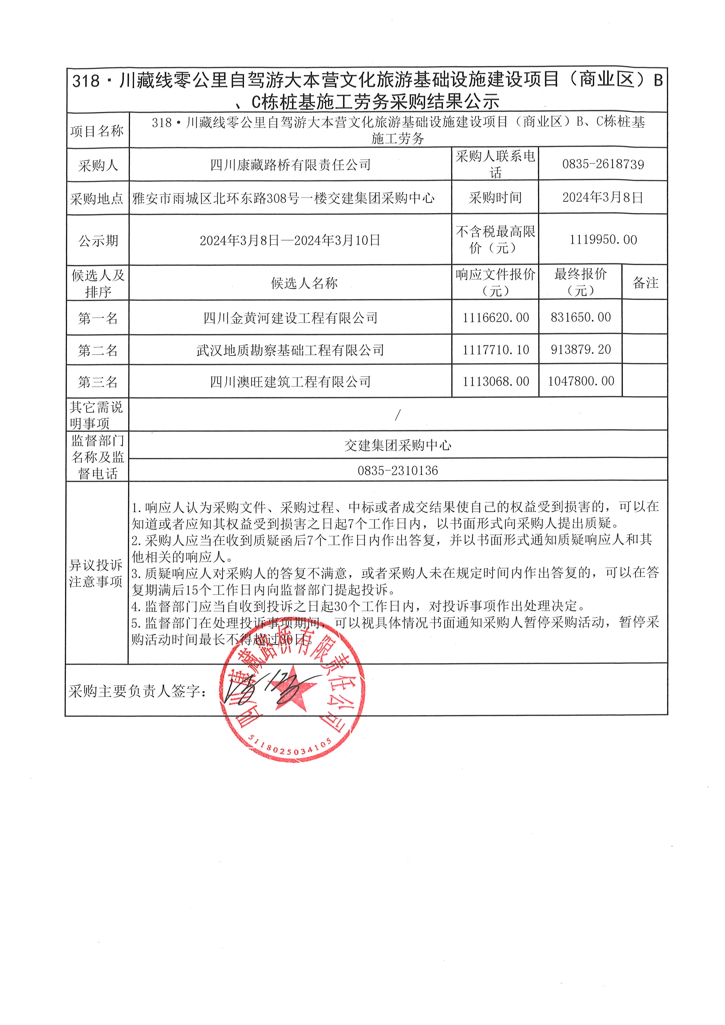 四川康藏路橋有限責(zé)任公司318·川藏線零公里自駕游大本營文化旅游基礎(chǔ)設(shè)施建設(shè)項(xiàng)目(商業(yè)區(qū))B、C棟預(yù)制管樁采購結(jié)果公示