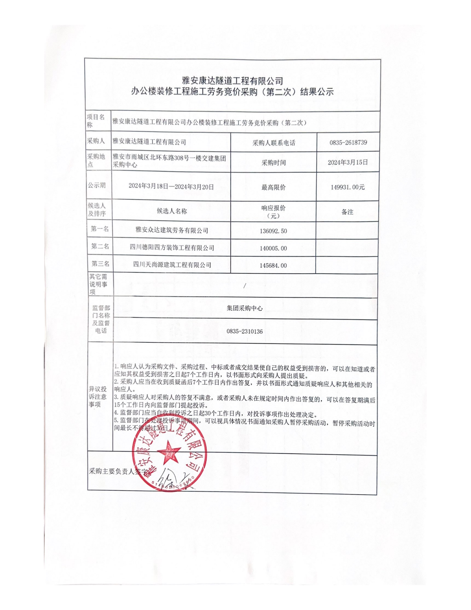 雅安康達(dá)隧道工程有限公司辦公樓裝修工程施工勞務(wù)競(jìng)價(jià)采購(第二次)結(jié)果公示