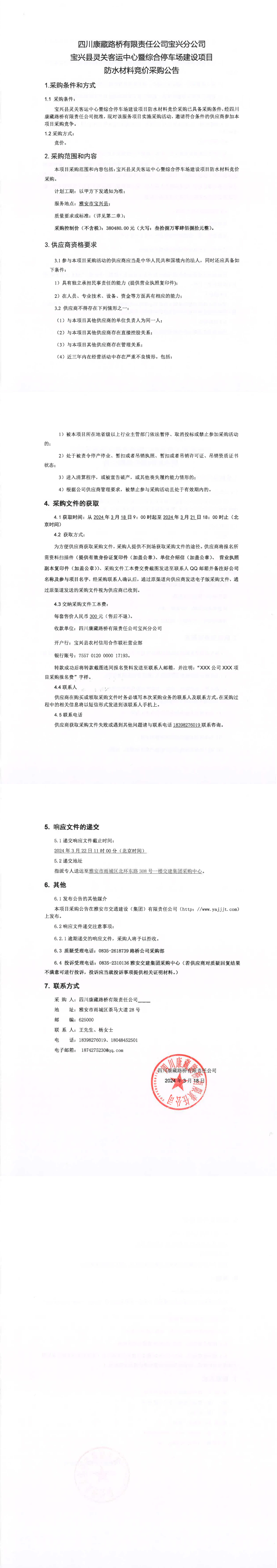 四川康藏路橋有限責(zé)任公司寶興縣靈關(guān)客運(yùn)中心暨綜合停車(chē)場(chǎng)建設(shè)項(xiàng)目防水材料競(jìng)價(jià)采購(gòu)公告