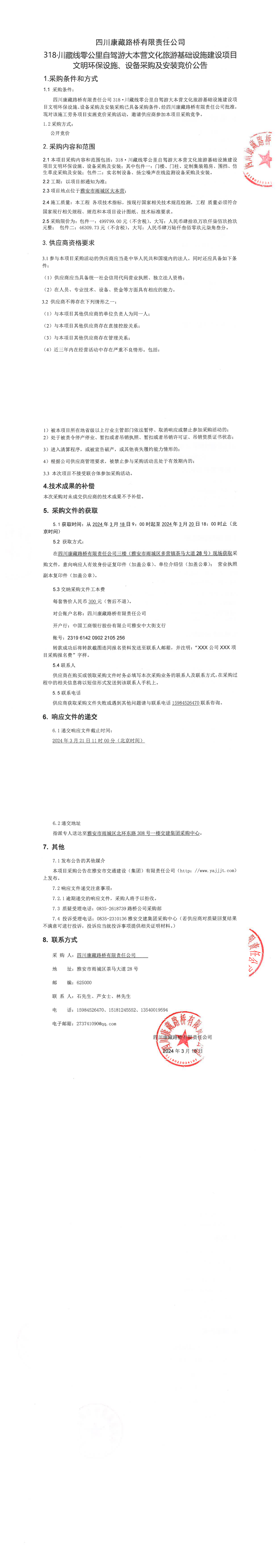 四川康藏路橋有限責(zé)任公司318·川藏公路零公里自駕游大本營文化旅游基礎(chǔ)設(shè)施建設(shè)項目文明環(huán)保設(shè)施、設(shè)備采購及安裝競價公告