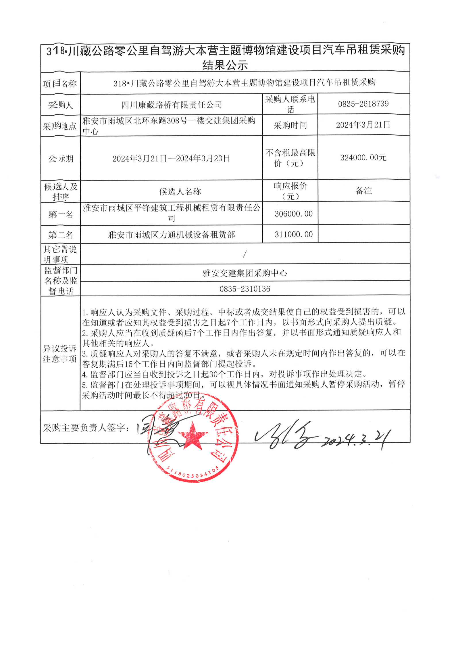 四川康藏路橋有限責(zé)任公司318·川藏公路零公里自駕游大本營(yíng)主題博物館建設(shè)項(xiàng)目汽車(chē)吊租賃采購(gòu)結(jié)果公示