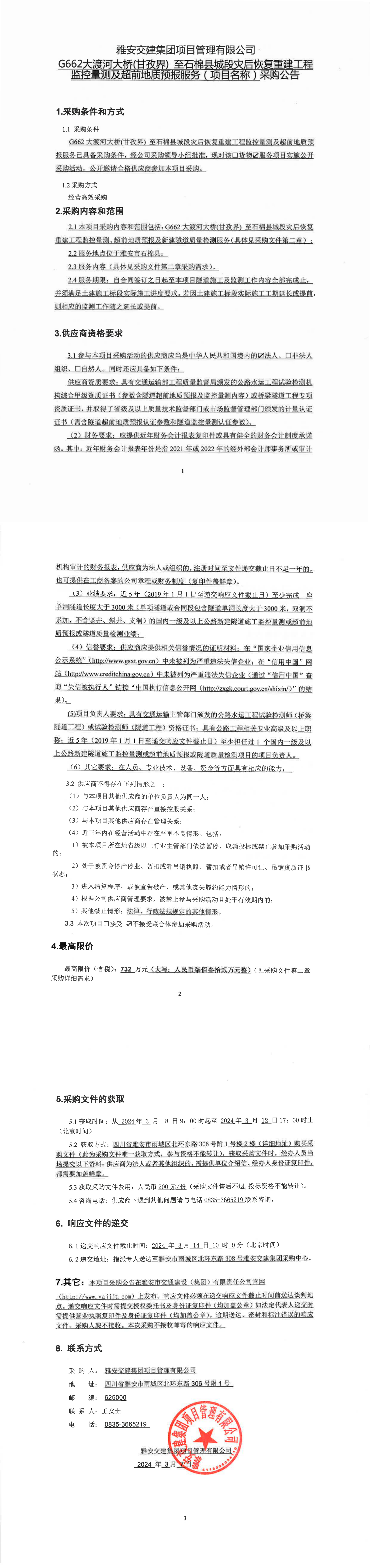 雅安交建集團(tuán)項(xiàng)目管理有限公司G662大渡河大橋(甘孜界)至石棉縣城段災(zāi)后恢復(fù)重建工程監(jiān)控量測(cè)及超前地質(zhì)預(yù)報(bào)服務(wù)(項(xiàng)目名稱(chēng))采購(gòu)公告
