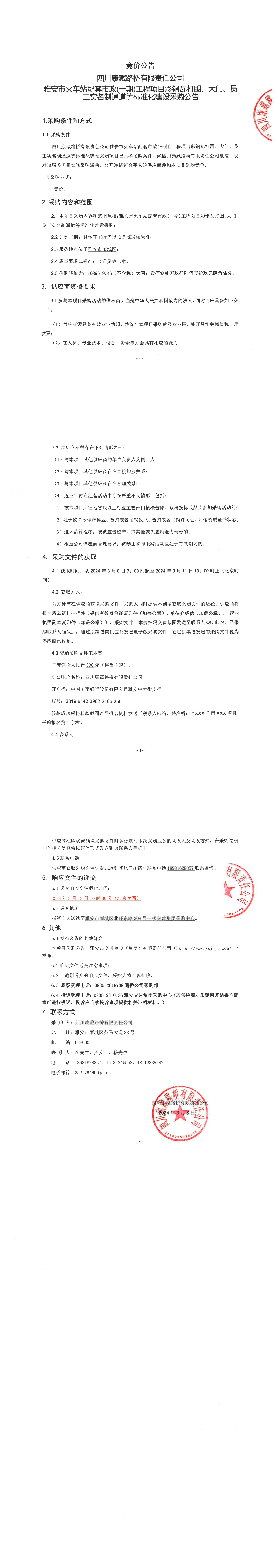 四川康藏路橋有限責(zé)任公司雅安市火車站配套市政(一期)工程項(xiàng)目彩鋼瓦打圍、大門、員工實(shí)名制通道等標(biāo)準(zhǔn)化建設(shè)采購公告