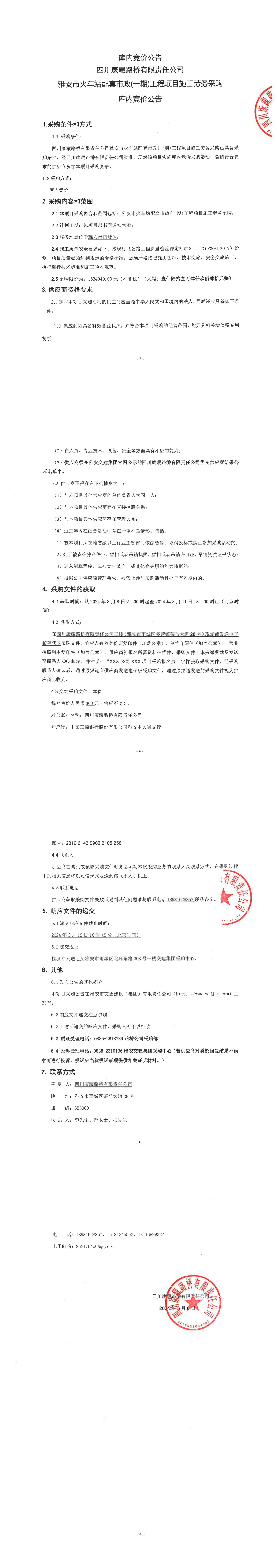 四川康藏路橋有限責任公司雅安市火車站配套市政(一期)工程項目施工勞務采購庫內(nèi)競價公告